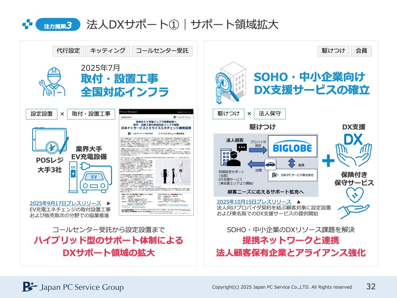 法人DXサポートについてです。こちらは順調に推移しています。冒頭でサポートインフラとして「取付・設置工事の全国対応ができるようになりました」とご説明したとおり、9月17日にリリースを出し、「EV充電エネチェンジ」と取付・設置工事サービスを開始しています。もちろん、同様の設置工事にも拡大対応が可能となります。