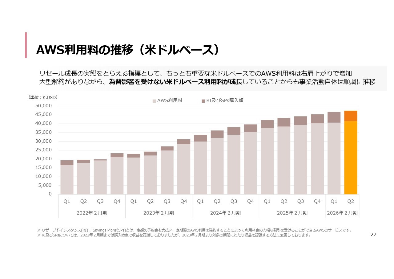 ドルベースでのAWS利用料の推移です。非常に重要なチャートであり、株主や投資家のみなさまにも毎回お伝えしています。第1四半期にサーバーワークスで非常に大きな解約がありましたが、それを乗り越え、順調に右肩上がりで推移しています。AWSの市場自体がまだ成長していることがおわかりいただけると思います。