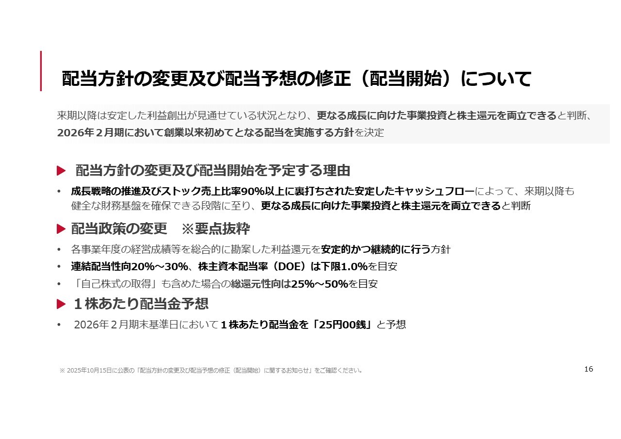 営業キャッシュフローの観点では非常に堅調に推移しており、来期以降も安定した利益創出が見込めると判断しています。これまで利益は全額内部留保としてきましたが、2026年2月期末を基準日として、1株あたり25円の配当を開始することを決定し、株主還元を積極的に行っていく方針です。