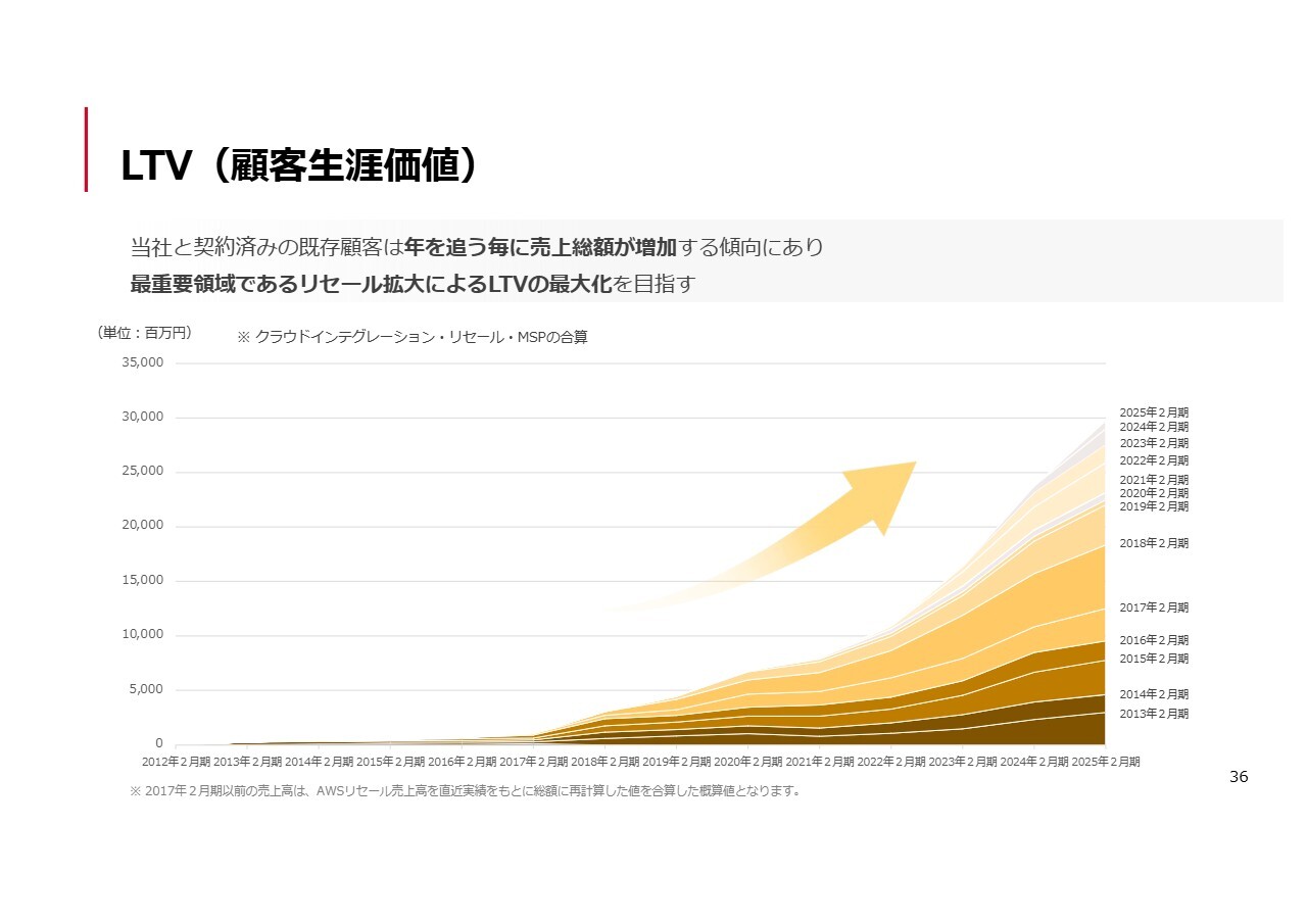 ここからは補足データのご説明です。こちらのチャートは、毎回ご紹介しているLTV(顧客生涯価値)のチャートです。大変ありがたいことに、2012年以前からご契約いただいているお客さまを含め、みなさまの売上高が積み重なり、しっかりとした伸びを実現していることがおわかりいただけると思います。