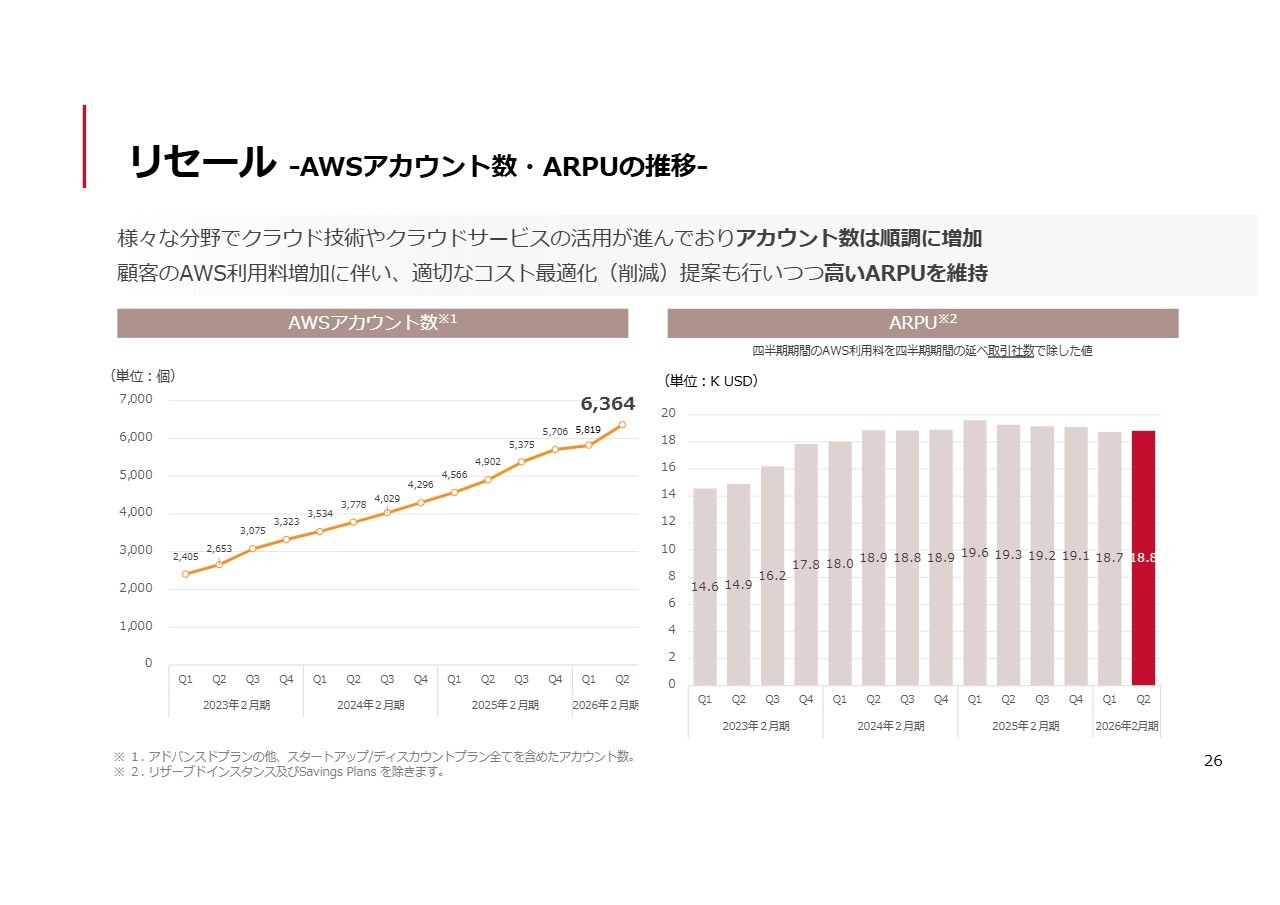 リセールの伸びを示すAWSアカウント数と、お客さまあたりの単価の推移についてです。ご覧のとおり、アカウント数は非常に大きく伸びています。単価については、当社がお客さまの利用料が増えすぎないような活動をしっかりと継続していることもあり、コントロールが非常にうまくいっていると理解しています。