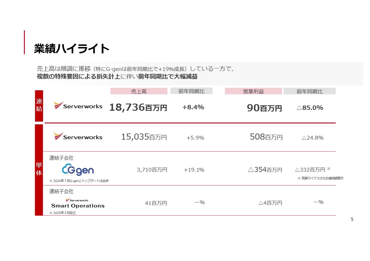 業績ハイライトです。第2四半期の売上高は、サーバーワークスグループ全体で187億3,600万円となり、前年同期比8.4パーセント増となりました。営業利益は9,000万円で、内訳としてはサーバーワークス単体で5億800万円、G-genでマイナス3億5,400万円となり、ほとんどの利益がG-genの赤字によって相殺されている状況です。