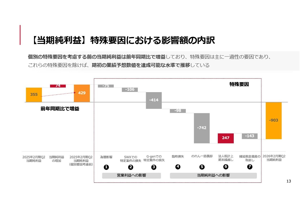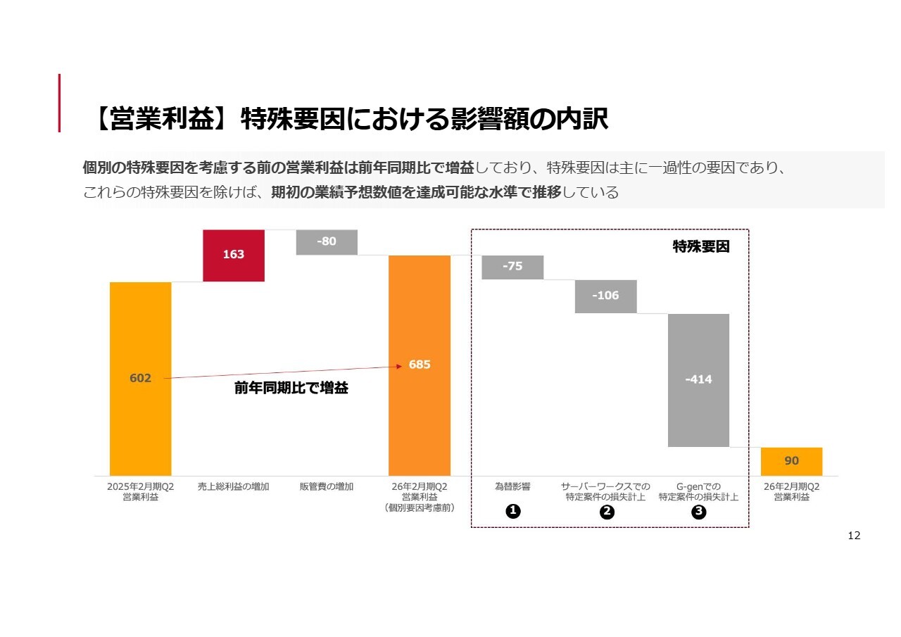 G-genでは非常に大きな不採算プロジェクトが発生したことに伴い、G-genの買収時、正確にはトップゲート買収時の事業計画の達成が見込めないと判断し、のれんを一括償却しました。これにより、繰延税金資産の回収可能性がなくなり、会計上の法人税が増加しています。こちらも一過性の要因と理解しています。