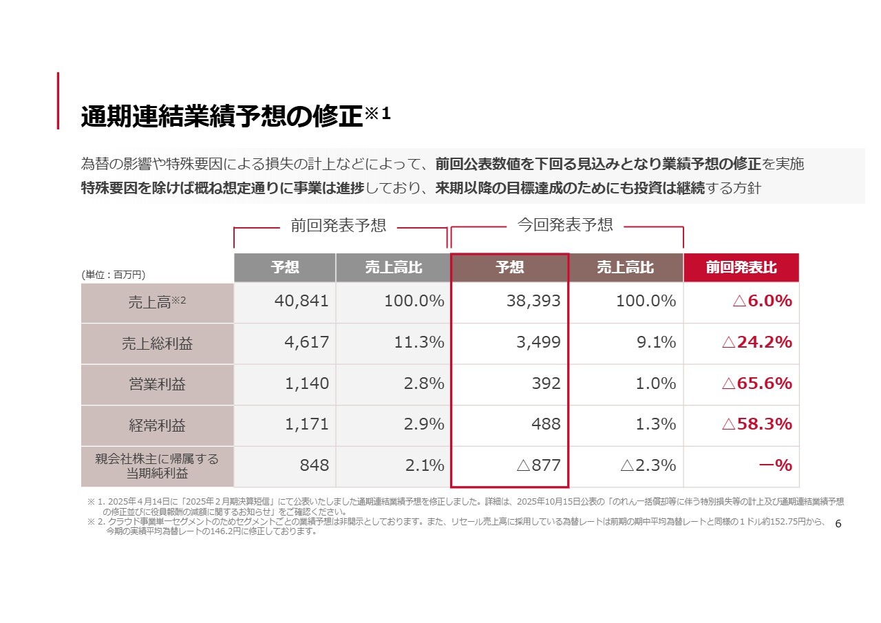 これらはいずれも今期一過性の要因と理解していますが、これらの要因が集中したことで下方修正となりました。