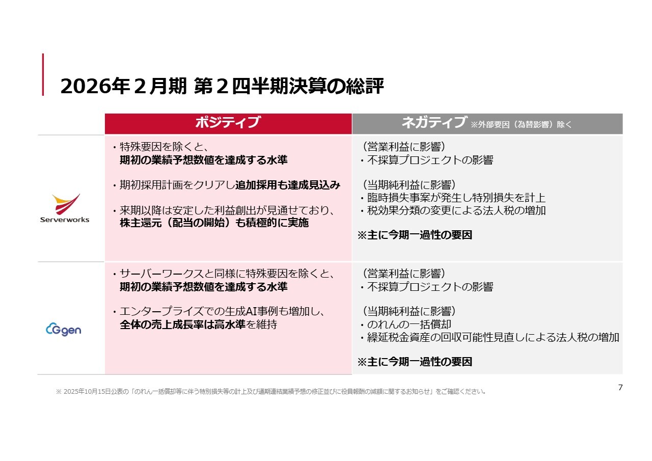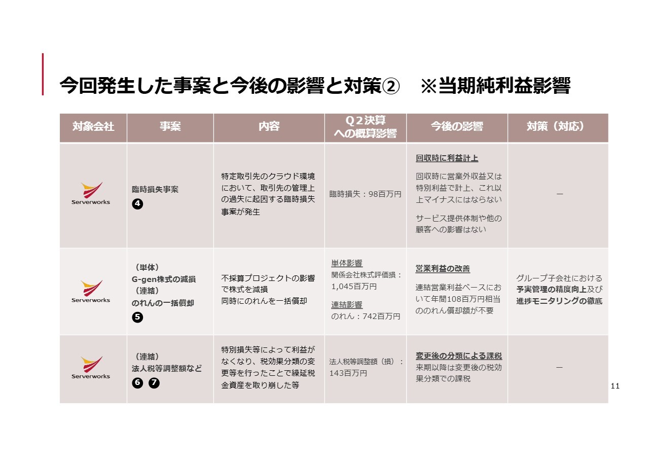 サーバーワークスでは、大型の不採算プロジェクトが発生しました。また、特定のお客さまでセキュリティブリーチが発生し、特別損失が発生しています。この件については、お客さまと回収方法を協議中です。さらに、税効果分類の変更により会計上の法人税が増加する結果となりました。