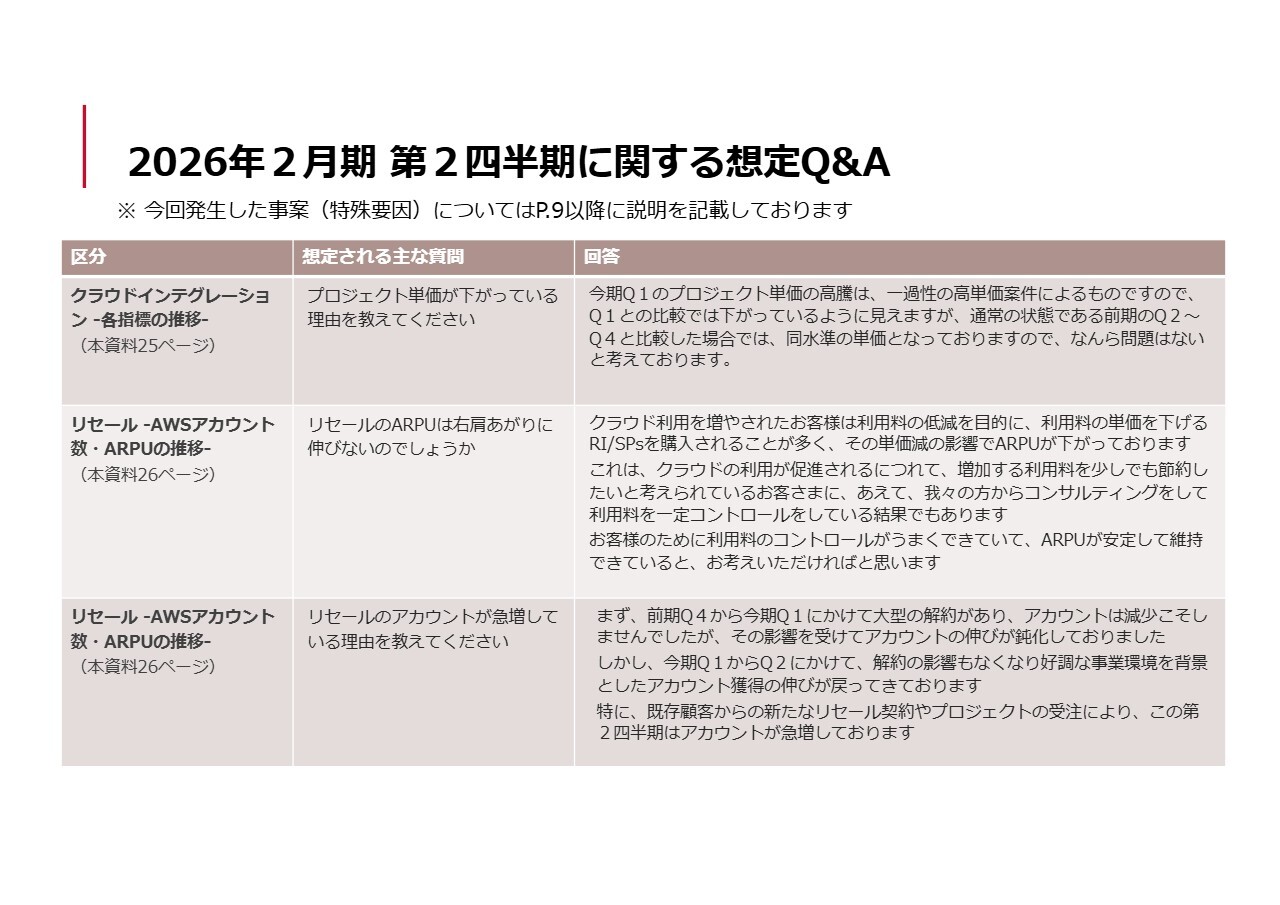 1つ目は、「クラウドインテグレーションの分野で、プロジェクト単価が下がっている理由を教えてください」というご質問です。第1四半期に非常に高単価な案件があったため、一過性の要因と考えています。これを除けば、順調に右肩上がりを続けているというのが当社の理解です。