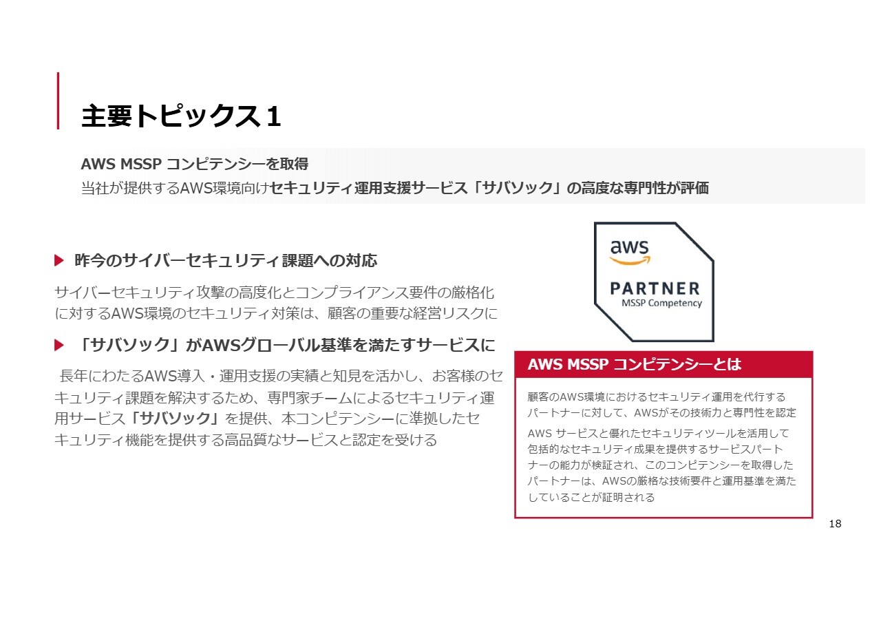 まず1つ目が、「AWS MSSP コンピテンシー」を取得したというニュースです。こちらは「Managed Security Service Provider(マネージドセキュリティサービスプロバイダー)」の略で、当社がAWSからマネージドセキュリティサービスを提供する十分な能力があると認定されたものです。