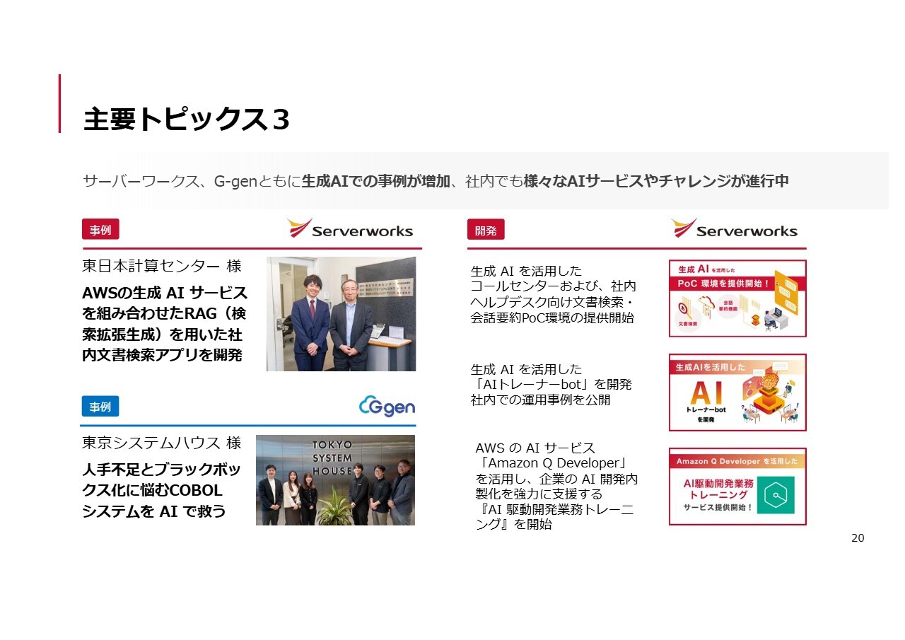 3つ目は、サーバーワークスおよびG-genの両社による生成AI事例に関するトピックスです。サーバーワークスでは東日本計算センターさまで、G-genでは東京システムハウスさまで、それぞれユニークな生成AIの事例が発表されています。
