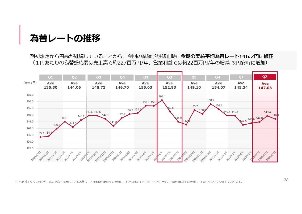 為替レートの推移についてです。足元では円安が進行していますが、第2四半期は147円で推移しました。今回の下方修正に合わせて、実績の平均為替レートを146.2円に修正しています。これにより、今後は為替の影響を受けにくいガイダンスになっていると考えています。