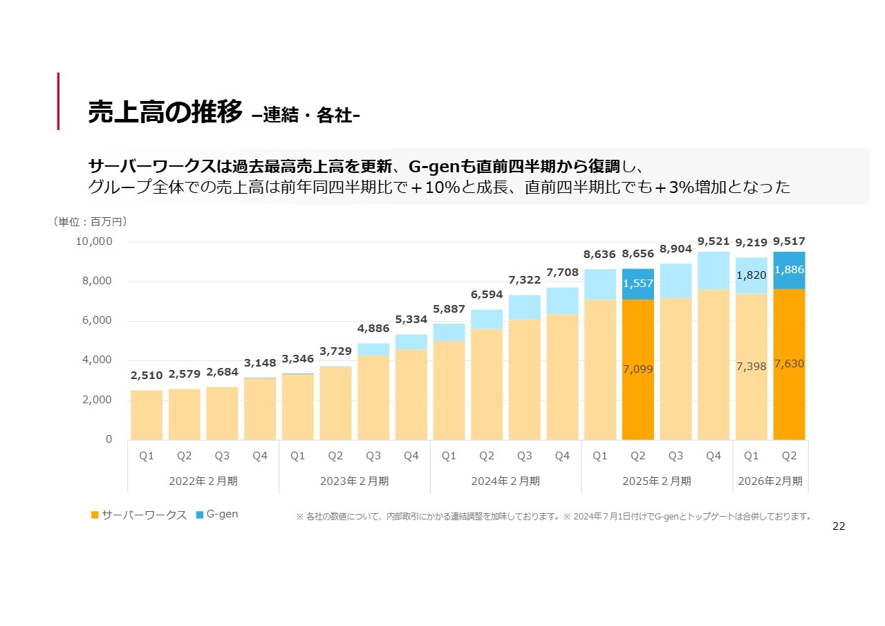 ここからは業績の詳細についてご説明します。第1四半期は昨年末に発生した大きな解約の影響を受けて落ち込んでいましたが、第2四半期では、特にサーバーワークスにおいて、昨年の第4四半期の水準まで回復が進んでいる状況です。