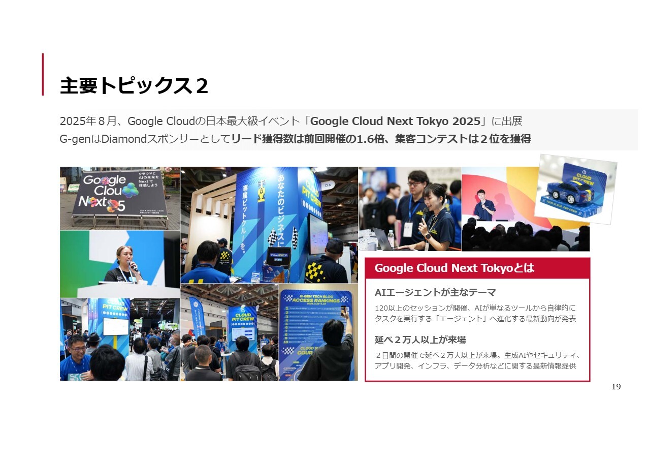 2つ目は、G-genが「Google Cloud Next Tokyo 2025」に出展したというニュースです。「Google Cloud」も、「Gemini」や「Google Agentspace」といった領域で非常に大きな盛り上がりを見せており、G-genは集客コンテストで2位を獲得しました。AI分野においても非常に賑わいを見せたというトピックスです。