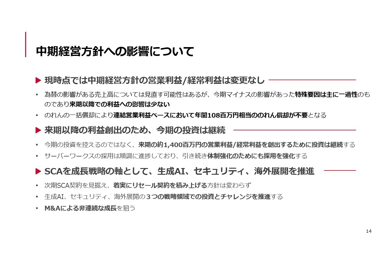 そして、SCA(戦略的協業契約)を成長戦略の軸として、生成AI・セキュリティ・海外進出の3つを変わらず推進していきたいと考えています。