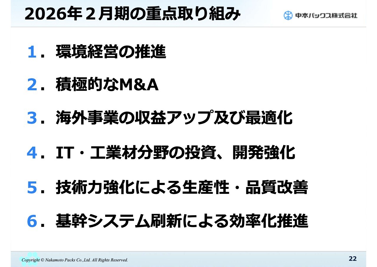 2026年2月期の重点取り組みについてご説明します。今期の重点取り組みとしては、期初に掲げた6つの目標の推進を進めています。