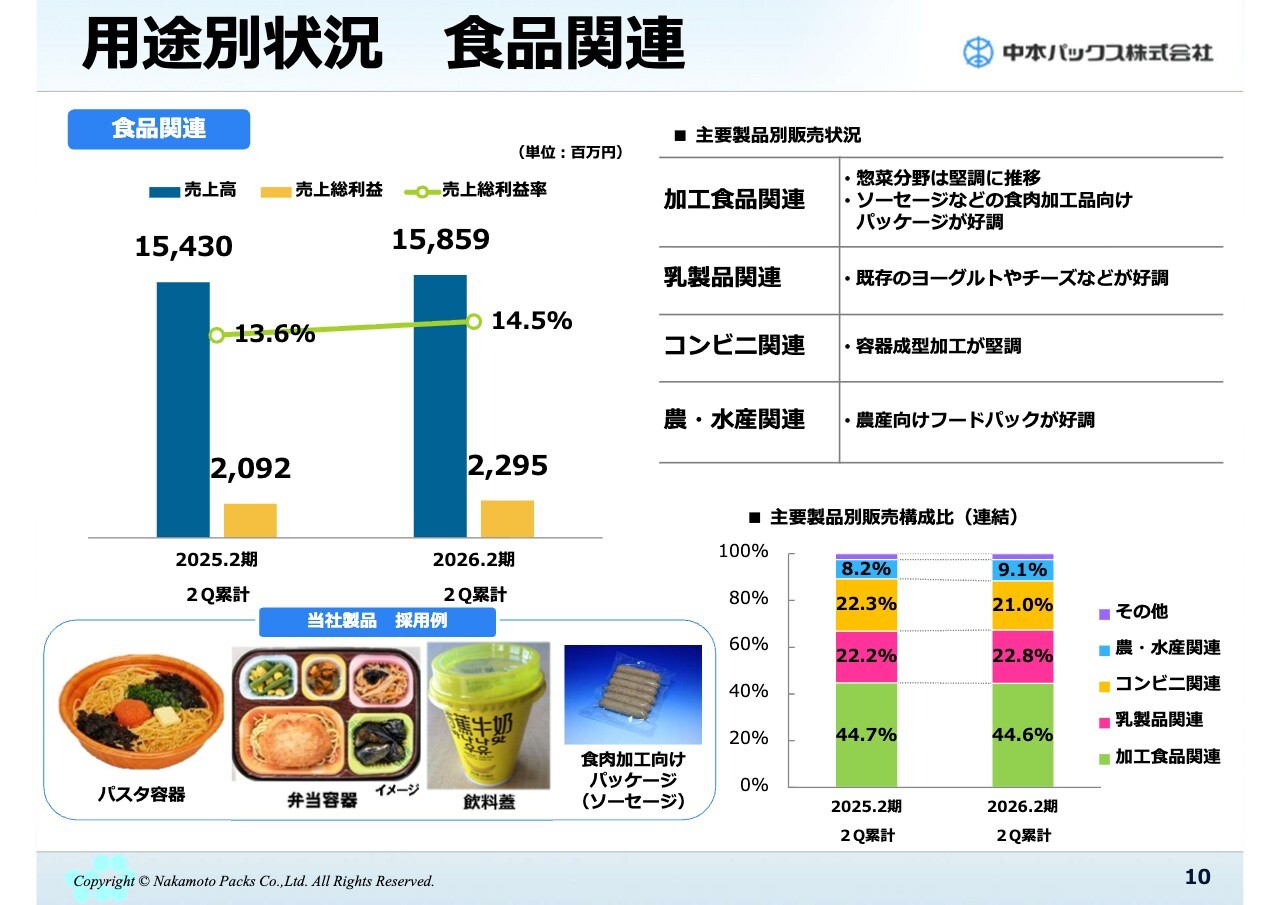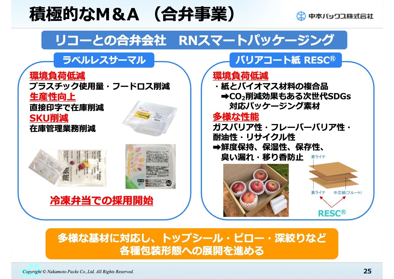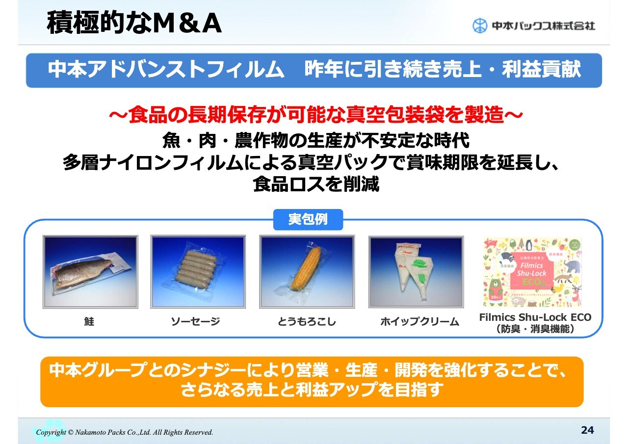 食品関連では、連結子会社化した中本アドバンストフィルム株式会社の売上及び利益貢献を見込んでいます。また、最近コンビニやスーパーなどで増えている冷凍弁当で採用されたラベルレスサーマルトップシールや、「RESC」をはじめとする環境対応包材の受注増加も見込んでいます。