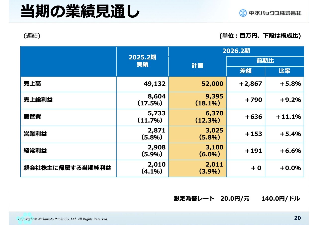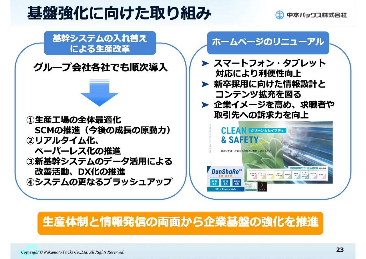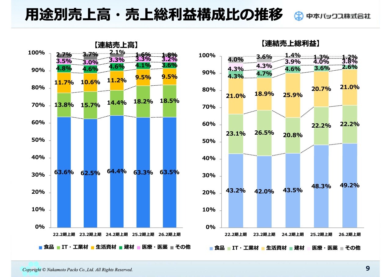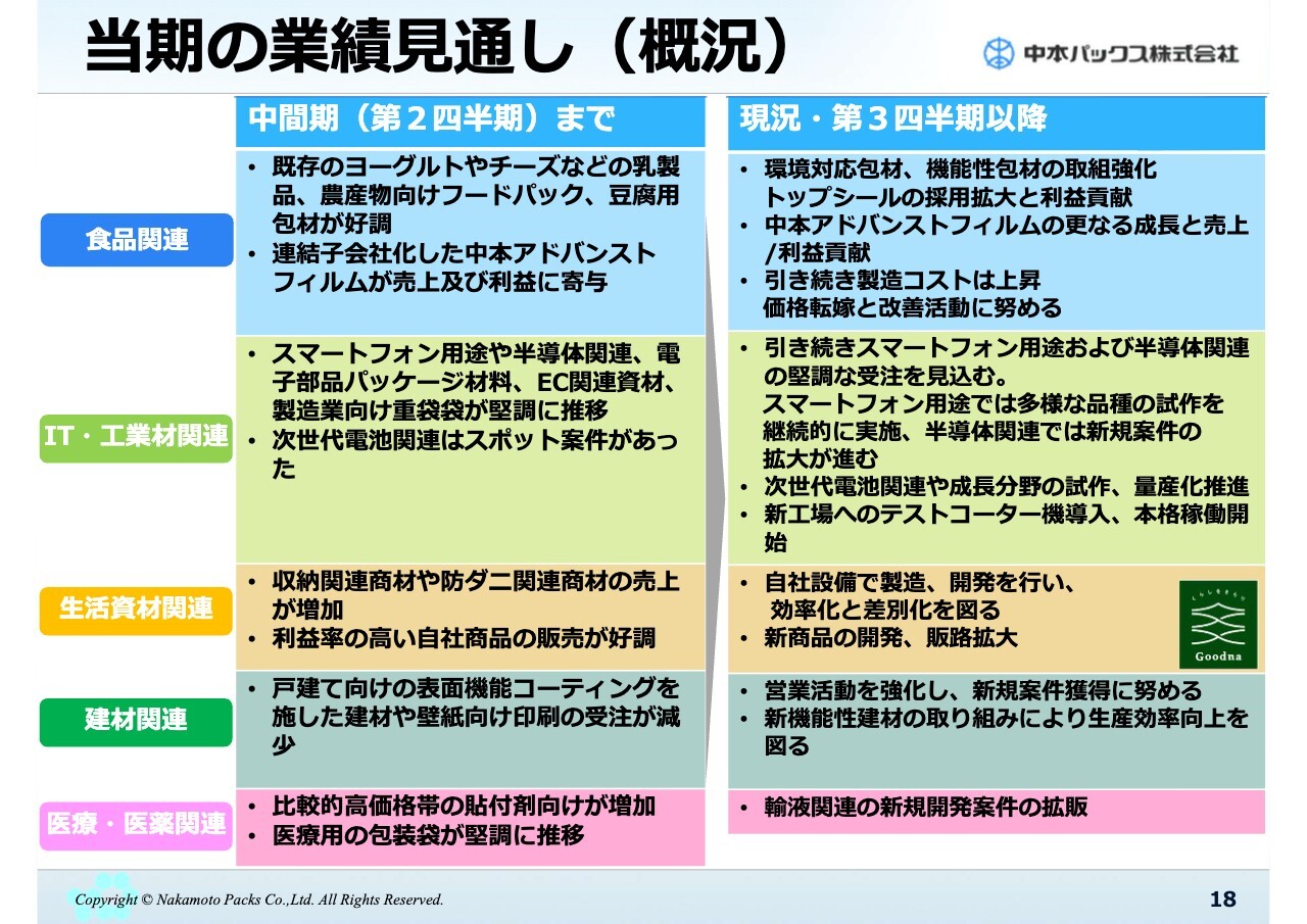 食品関連では、連結子会社化した中本アドバンストフィルム株式会社の売上及び利益貢献を見込んでいます。また、最近コンビニやスーパーなどで増えている冷凍弁当で採用されたラベルレスサーマルトップシールや、「RESC」をはじめとする環境対応包材の受注増加も見込んでいます。