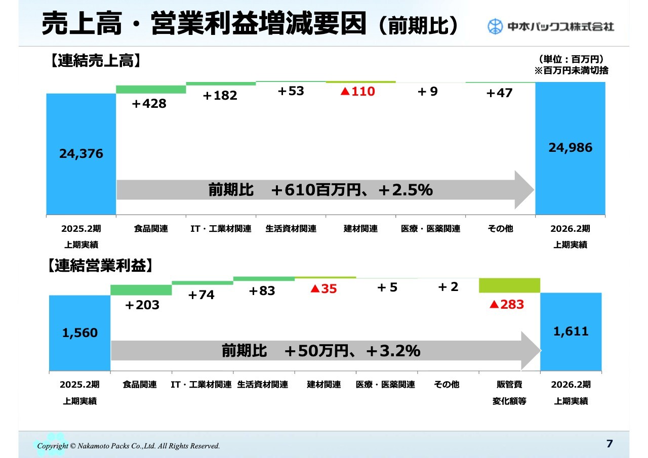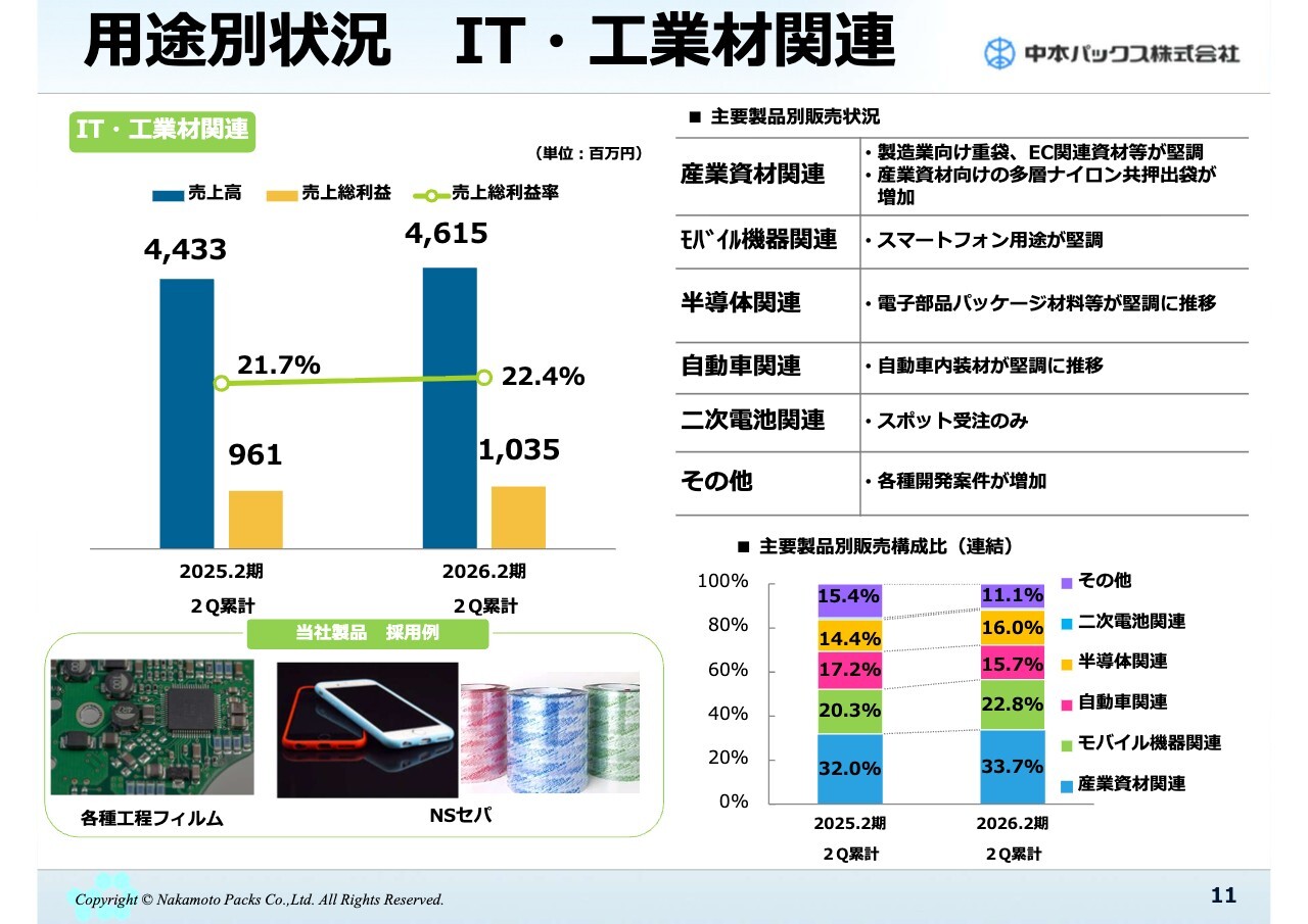 IT・工業材関連についてです。売上高は46億1,500万円、売上総利益は10億3,500万円で、前年同期比4.1パーセントの増収、7.8パーセントの増益となりました。特にスマートフォン用途、電子部品パッケージ材料、半導体関連、EC関連資材、製造業向け重袋が堅調に推移しています。