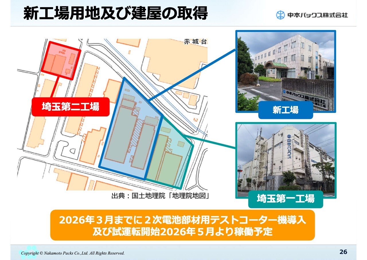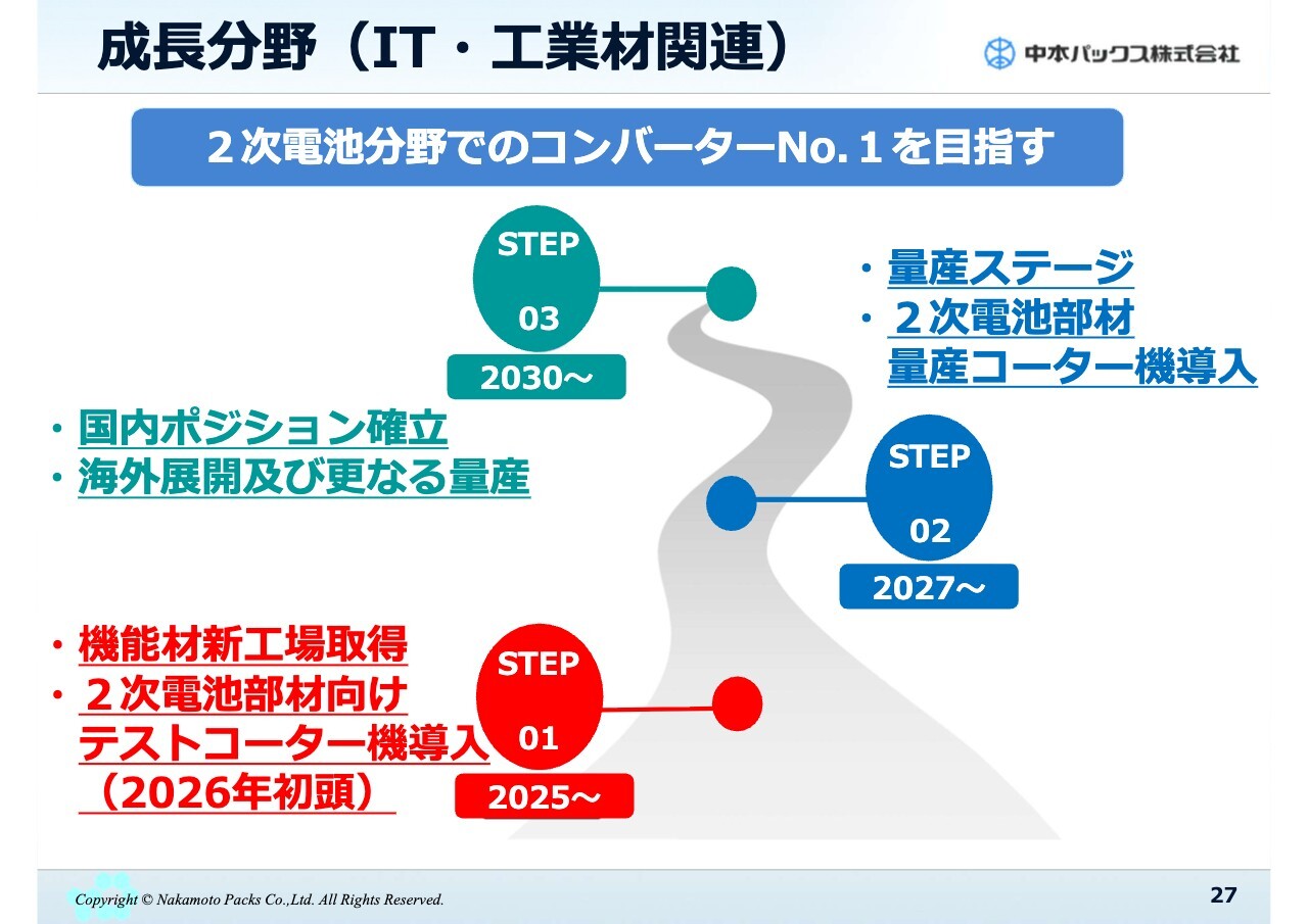 具体的には、2026年初頭に2次電池部材向けのテストコーター機を導入します。2027年には量産コーター機の仕様を決定し、自社でコーター機を作成して導入する予定です。