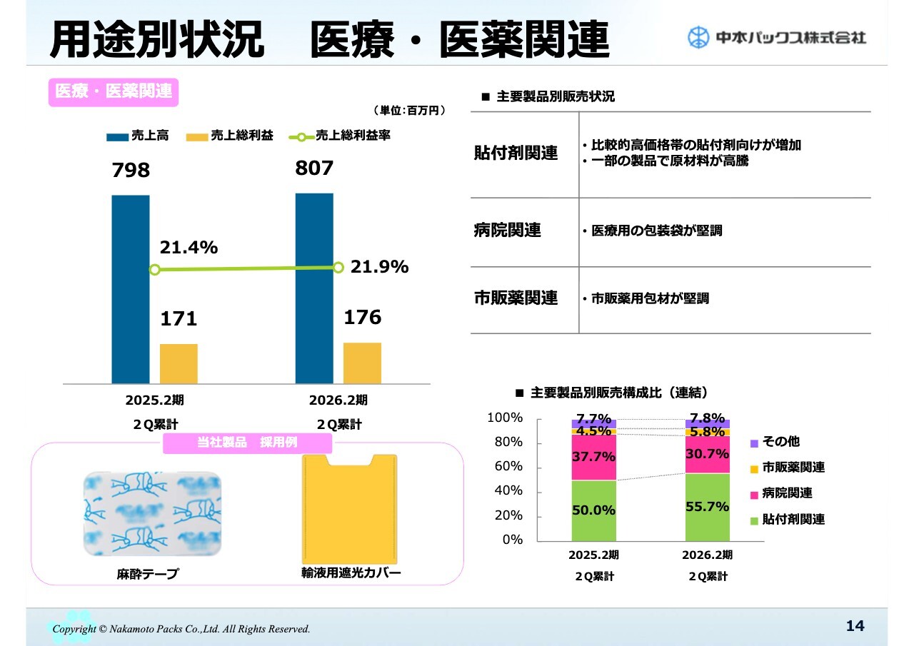 医療・医薬関連についてです。売上高は8億700万円、売上総利益は1億7,600万円で、前年同期比1.2パーセントの増収、3.2パーセントの増益となりました。病院関連では貼付剤関連が増加し、医療用の包装袋も堅調に推移しています。