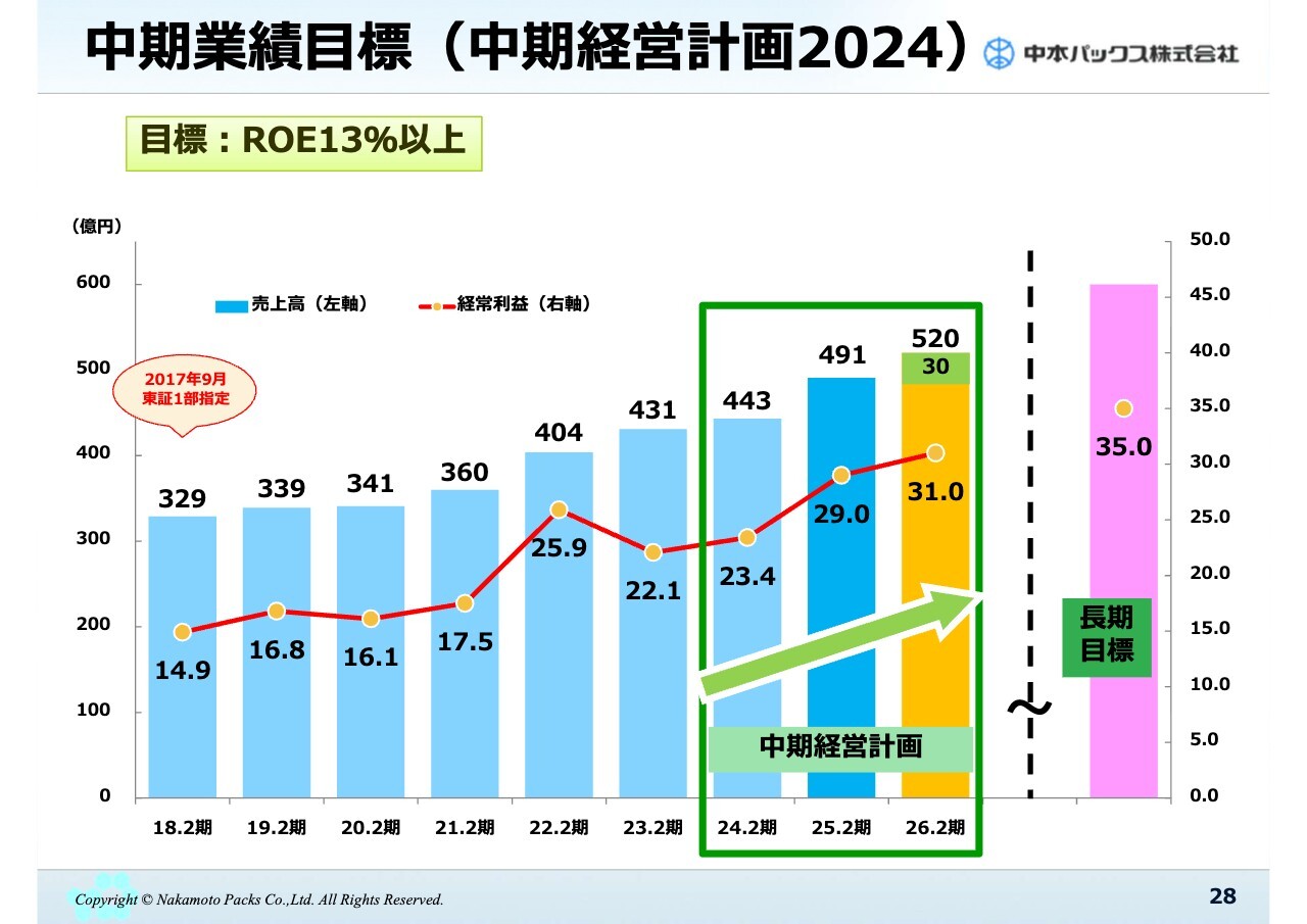 長期目標としてきた売上高500億円は今期に達成予定であり、経常利益目標の35億円も達成間近です。数字が確定次第、新しい3ヶ年計画と長期目標の見直しを行い、開示する予定です。