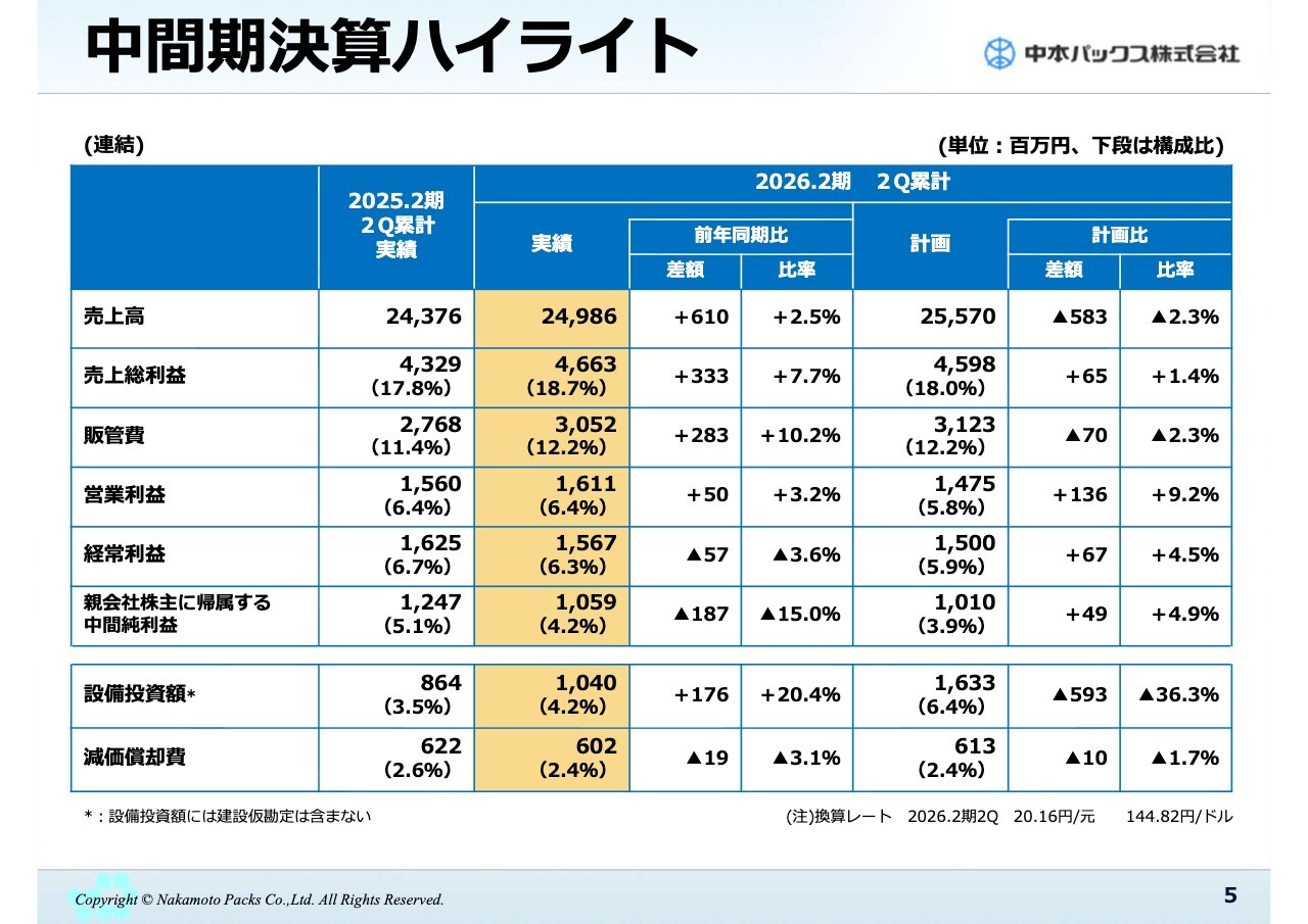 最初に、2026年2月期 中間期の決算概要についてご説明します。売上高は249億8,600万円で前期比2.5パーセント増、営業利益は16億1,100万円で前期比3.2パーセント増の増収増益となり、過去最高を更新しました。