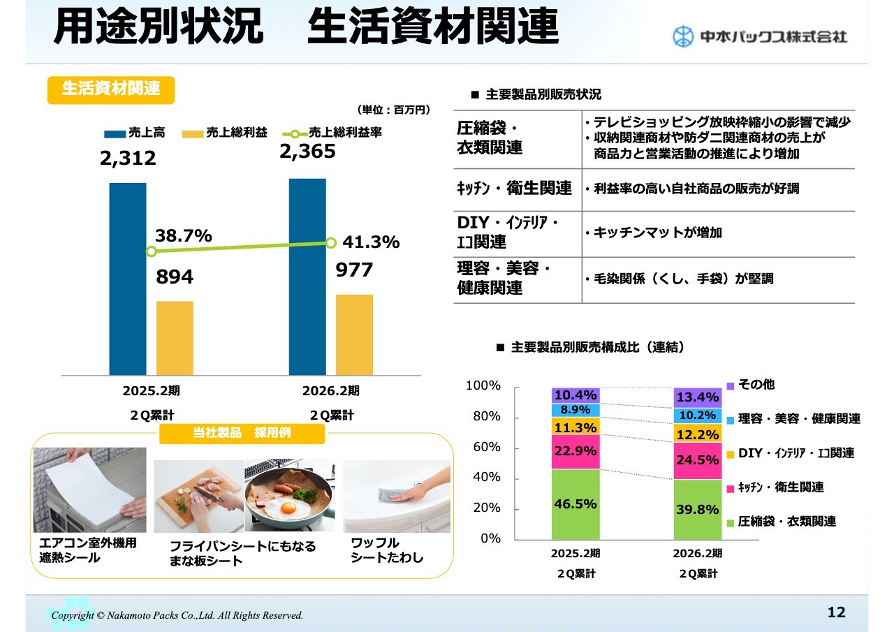 先ほどから申し上げているとおり、利益率の高い自社商品の販売が好調に推移したことに加え、収納関連商材や防ダニ関連商材の売上も、商品力と営業活動の推進により増加しています。