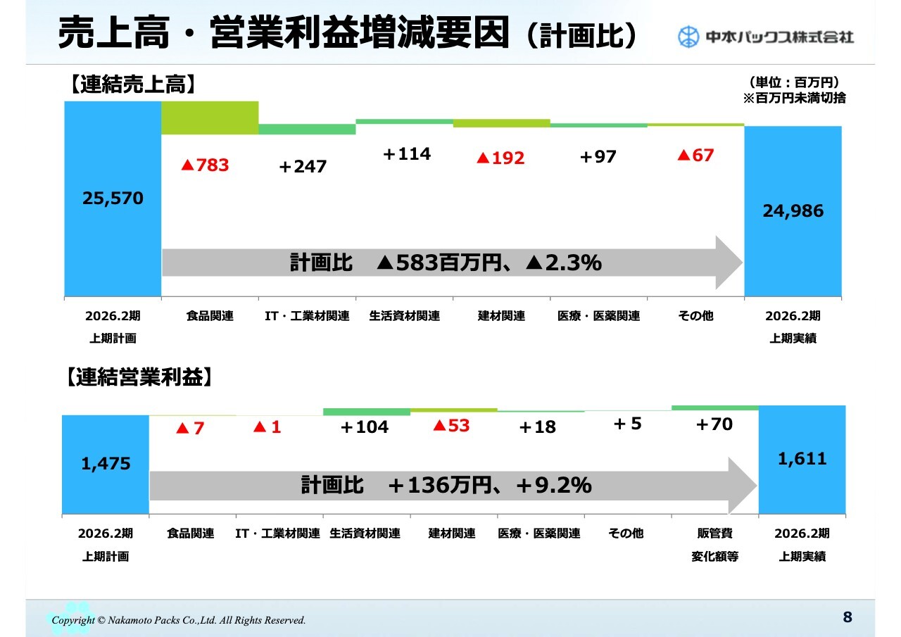 売上高は、食品関連の無地化の影響によってコンビニ関連が計画を下回って推移しています。一方で営業利益は、先ほど申し上げた生活資材関連において利益率の高い自社商品が好調だったことから、計画を上回って推移しています。
