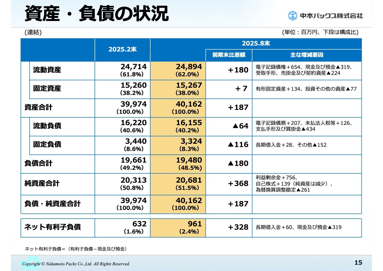 ネット有利子負債は9億6,100万円です。長期借入金が6,000万円増加、現預金が3億1,900万円減少したことにより、前期末比約3億2,800万円の増加となりました。