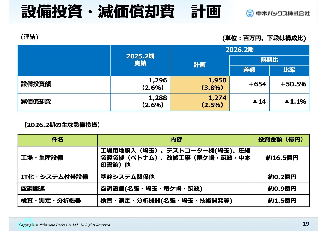 設備投資及び減価償却費の年間計画についてご説明します。今期の設備投資金額は19億5,000万円を計画しています。上半期は、埼玉新工場の用地(今年4月に取得済)や、新しく入れ替えたシステムの付帯設備などを購入しました。