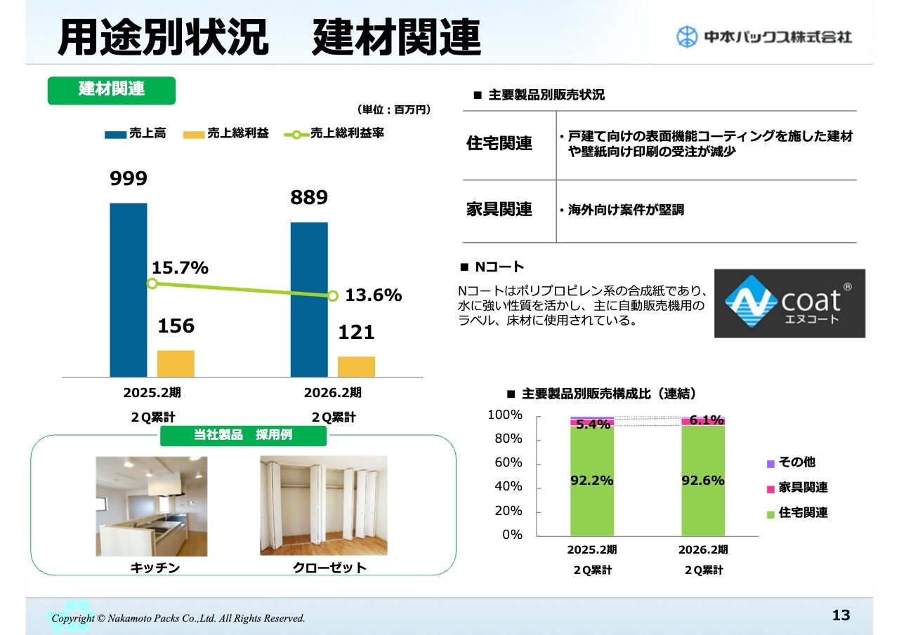 建材関連では、壁紙向けや表面機能コーティングを施した建材の受注が減少しています。世の中は建材に関して非常に逆風ですが、今後も営業活動を強化し、新規案件の獲得に努めるとともに、新機能性建材の取り組みを推進して、利益率の向上を図っている最中です。
