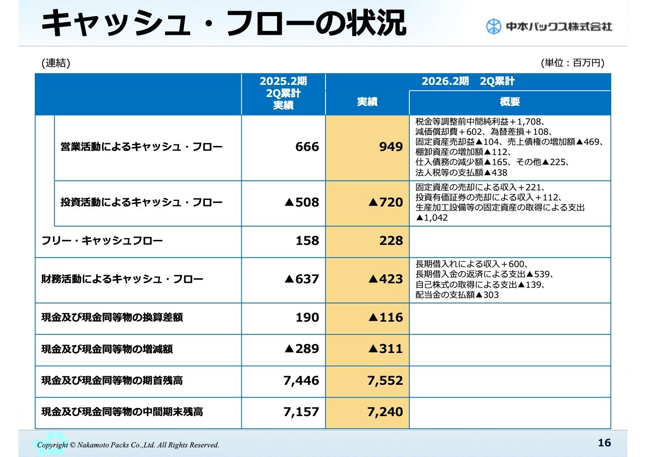 財務活動によるキャッシュ・フローは、長期借入金の返済や配当金の支払いなどにより4億2,300万円のマイナスとなりました。最終的に、現金及び現金同等物の中間期末残高は、前期末比3億1,100万円減少し、72億4,000万円となっています。