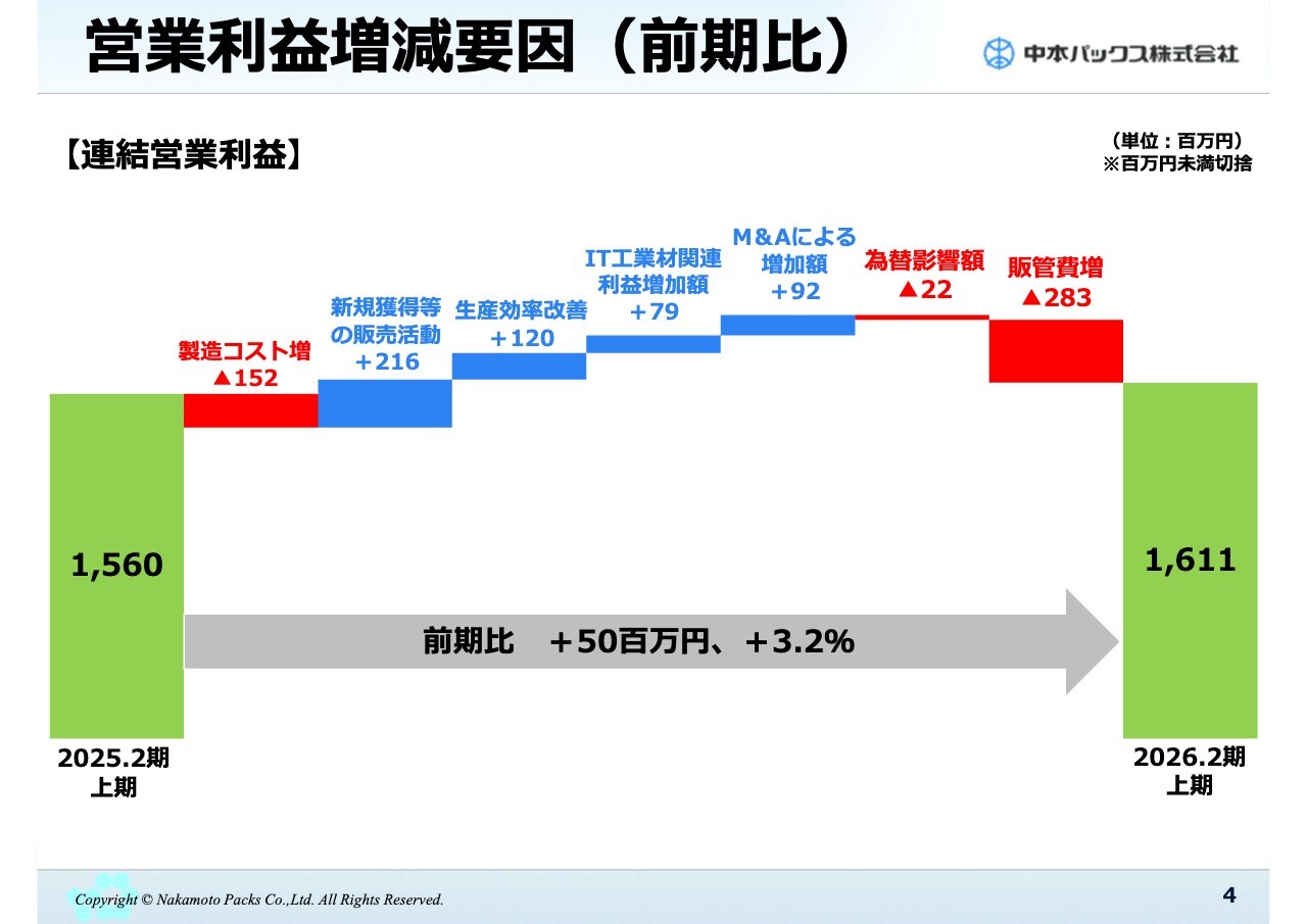 原材料や電気、物流費等の値上げにより、製造コストが上昇しました。しかし、新規顧客の獲得などの販売活動や生産効率の改善、IT工業材のスマートフォン分野などの需要増加、昨年連結子会社化した中本アドバンストフィルム株式会社の利益貢献があったことにより、営業利益は前年比5,000万円増加し、16億1,100万円となりました。