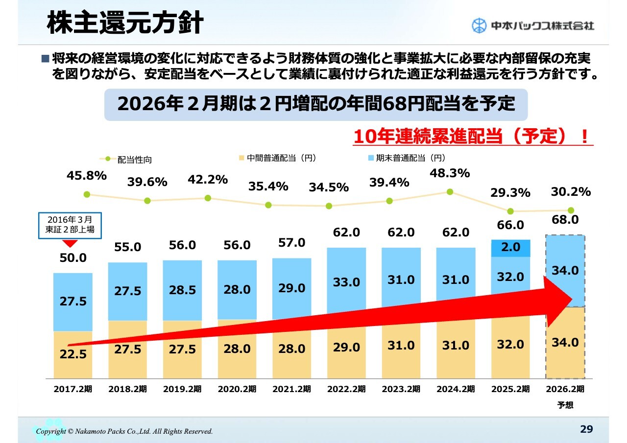 基本方針と2025年2月期の通期業績を踏まえ、期末配当は前回予想の32.0円から2円増加の34.0円とし、年間配当は66.0円となる見込みです。さらに2026年2月期では、66.0円から2円増配し、現時点では68.0円を予定しています。