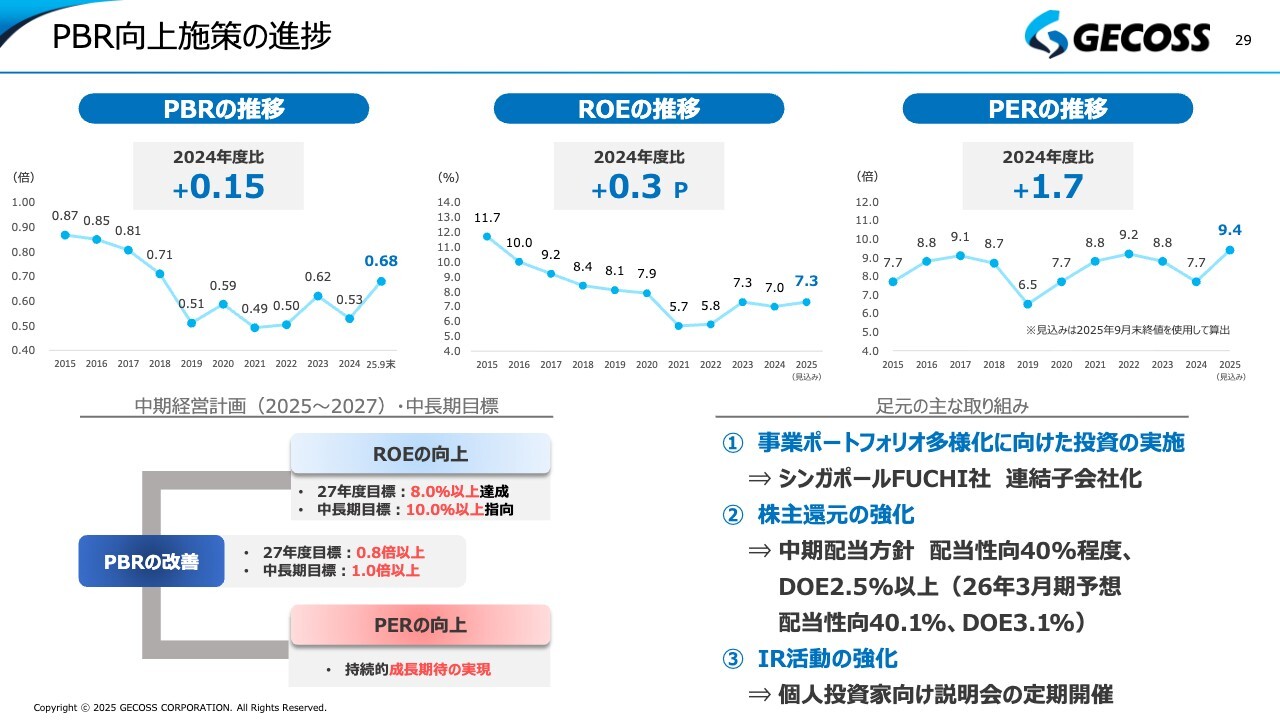 当社では、2028年3月期までの3年間を対象とした新しい中期経営計画において、PBRの目標を0.8倍以上に設定しました。昨年9月末時点では、PBRは0.5倍を若干下回る水準でしたが、現在は、日々変動しているもののおおよそ0.7倍を若干下回るレベルまで改善しています。このように、PBRは顕著に改善しており、2028年3月期の目標である0.8倍以上に向けて着実に近づいてきています。