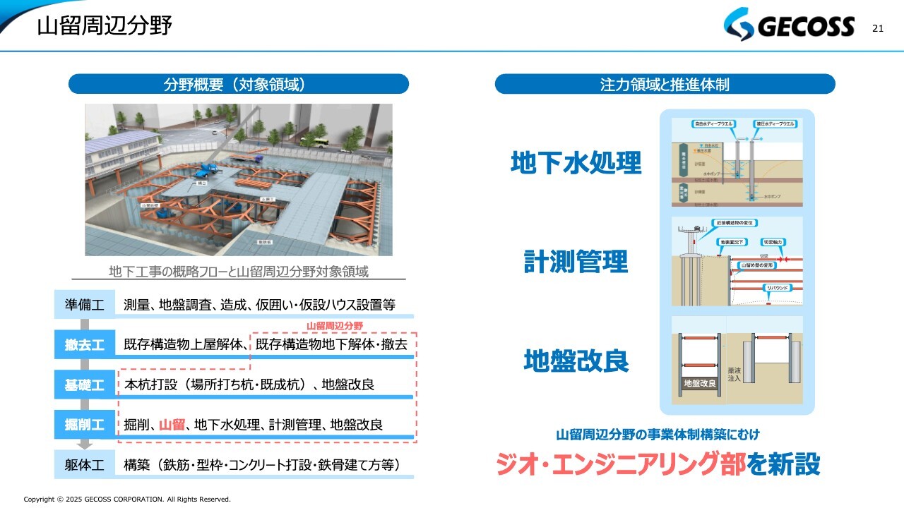 山留周辺分野についてです。中期経営計画のご説明などでもお伝えしましたが、ジオ・エンジニアリング部を今期新設し、新たな取り組みを進めています。建設工事と一言で言っても、スライド左側に記載しているとおり、当社が行っている山留(赤色の部分)以外にもさまざまな工事が積み重なることで物件が進捗していきます。