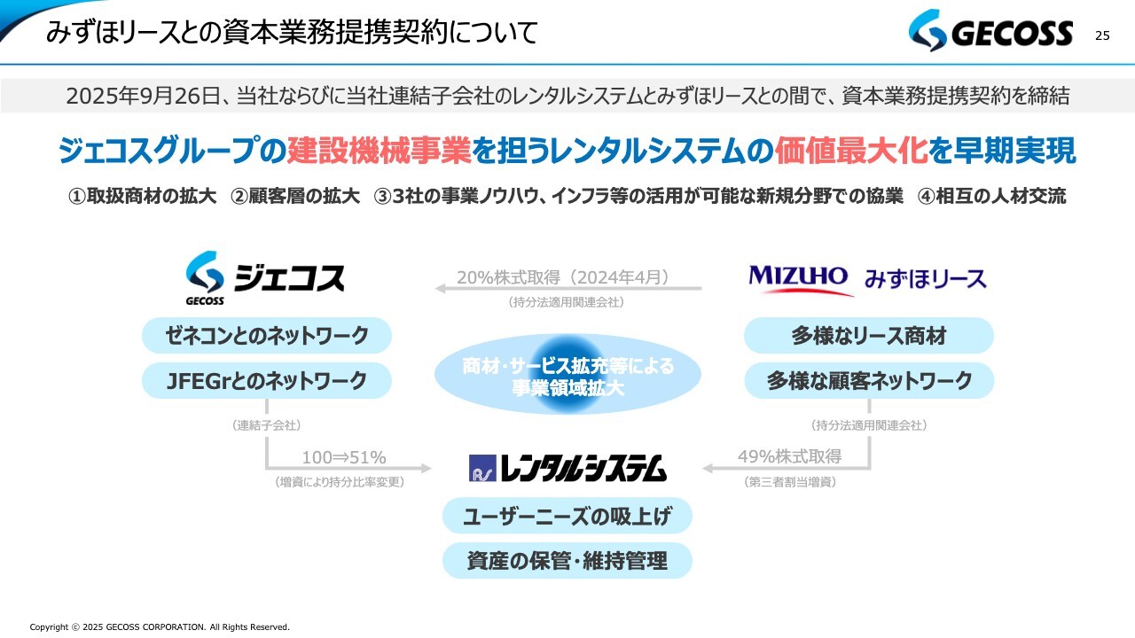 みずほリースとの資本業務提携契約についてです。本年9月、当社とレンタルシステム、そしてみずほリースの3社間で資本業務提携契約を締結しました。これにより、これまで当社の完全子会社であったレンタルシステムは、当社が51パーセント、みずほリースが49パーセントを出資する構成となりました。