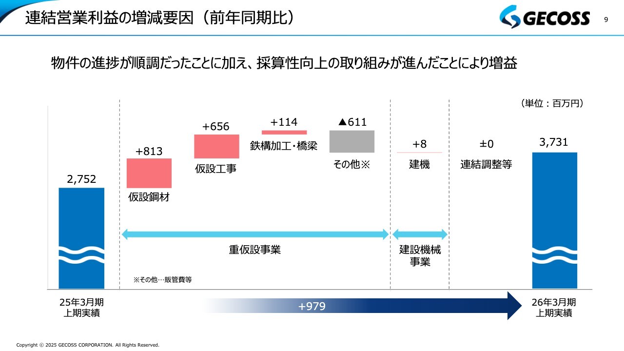 連結営業利益の増減要因についてです。仮設鋼材、仮設工事、鉄構加工・橋梁、そしてわずかですが建機、この4分野すべてで増益となりました。コスト増をしっかりとカバーした結果、前年同期の27億5,200万円から約37億円と、約10億円増加しました。この要因は、各部門におけるさまざまな改善活動の成果が表れた結果ではないかと考えています。