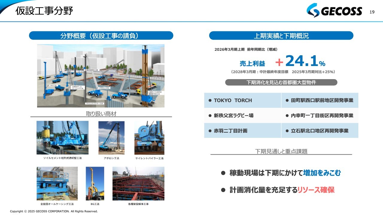 仮設工事についてです。先ほどからご説明しているとおり、上期業績において大幅な増加を牽引している分野です。ここ数年にわたる利益重視の取り組みが、最も成果を上げている分野の1つではないかと考えています。スライド右側に記載のとおり、上期の実績は売上利益ベースで前年同期比約24パーセントの大幅増となっています。