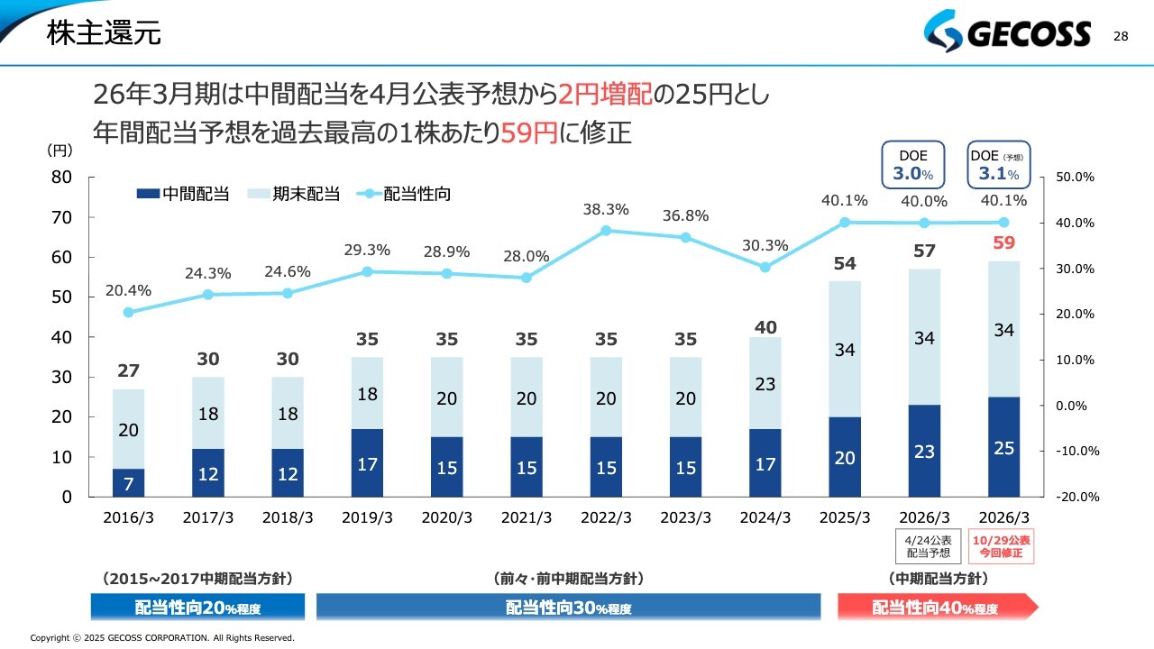 株主さまへの還元についてです。昨日発表したとおり、上期の実績が当初計画および前年同期比で大幅に増加したこと、さらに通期利益予想を上方修正したことを受けて、中期配当方針で設定している配当性向40パーセント程度をベースに、年間配当を57円から2円増配し59円に修正しました。なお、この2円の増配については、上期業績が大幅に向上したことを反映し、すでに権利確定済みの部分ではありますが、上期配当を23円から25円にすることとしました。