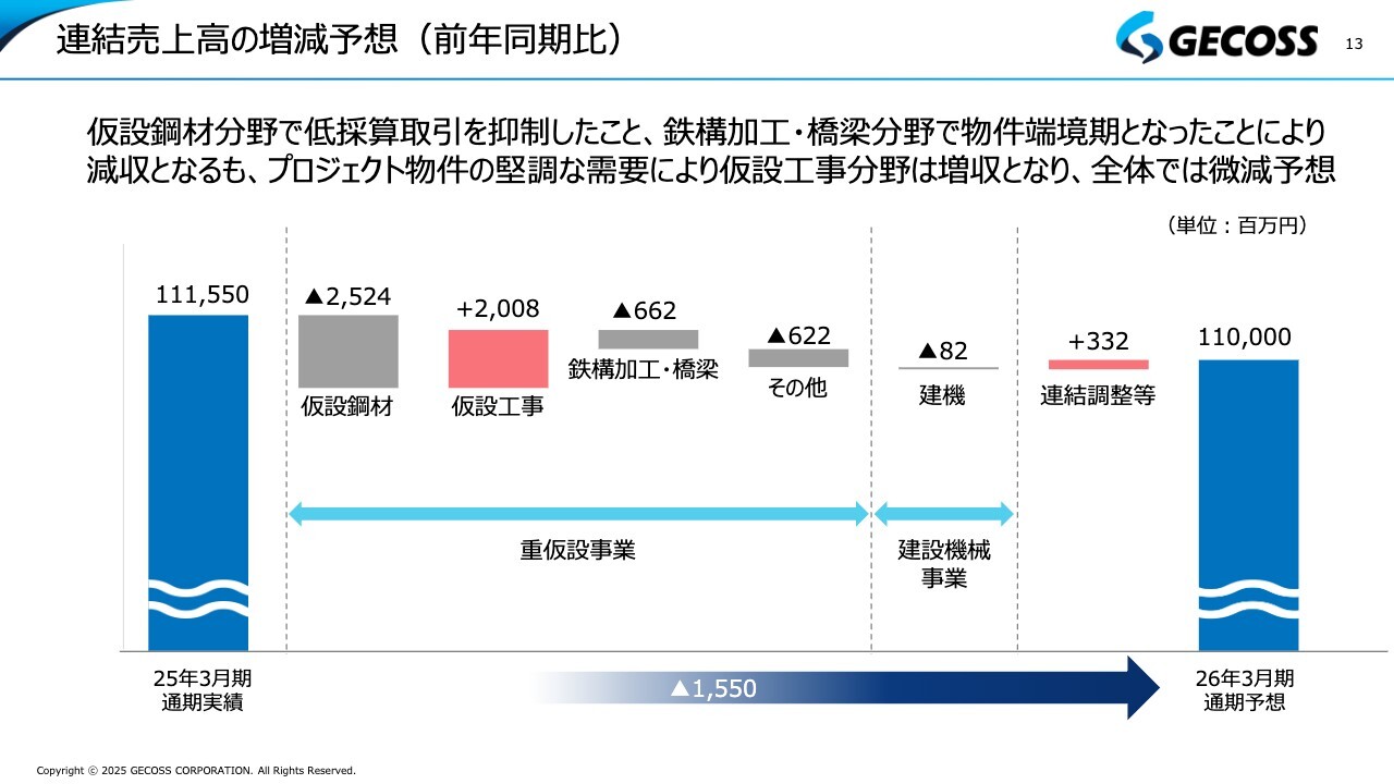 通期の連結売上高の増減予想についてです。こちらは先ほどご説明した上期の売上高増減要因と同様に、仮設鋼材が低採算の取引を抑制したことでマイナスになっていますが、賃貸部門では増収となり、仮設工事も全体を大きく牽引している状況です。