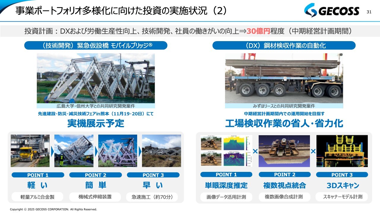 同様に、中期経営計画ではDX、労働生産性向上、技術開発、働きがいの向上などにも30億円程度の資金を投じていくことを掲げています。具体的な取り組みとして、2つ挙げたいと思います。
