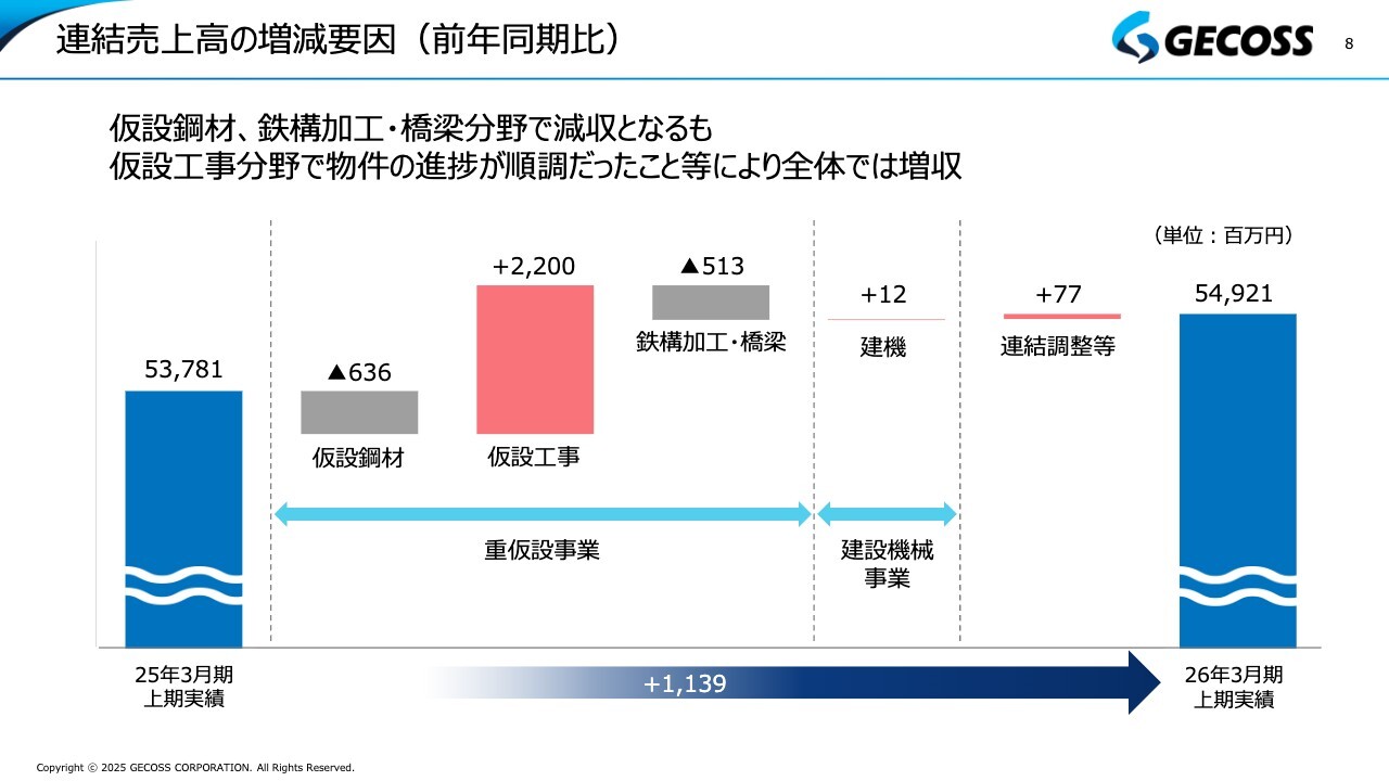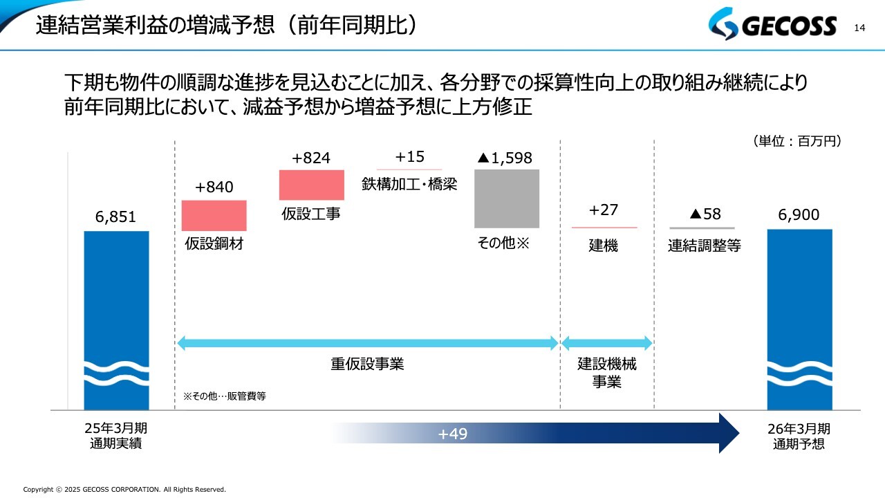 連結営業利益の増減予想についてです。上期と同様に仮設鋼材、仮設工事、鉄構加工・橋梁、建機の各部門で、しっかりとプラスを確保できている状況です。
