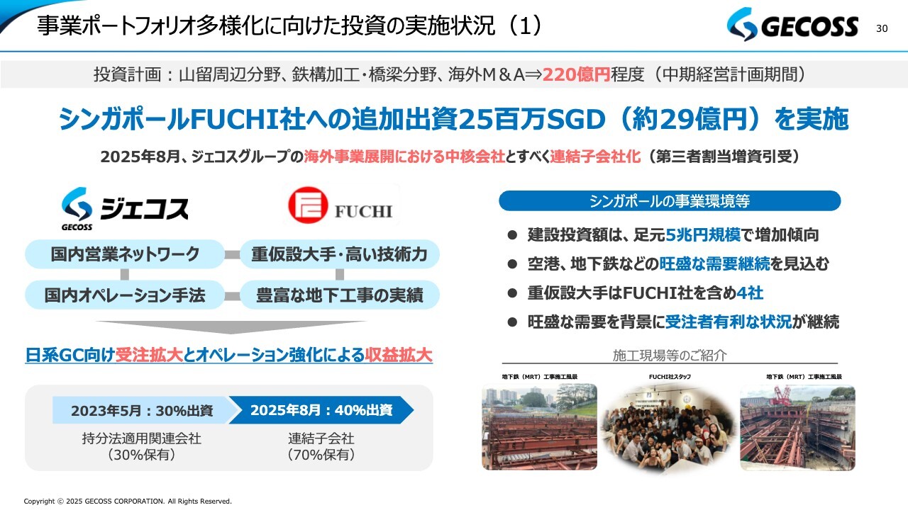 中期経営計画では、山留周辺分野、鉄構加工・橋梁、海外のM&Aなどで220億円程度を計画的に投資する方針を掲げています。1つ目の案件は、その最初の実現例となるシンガポールのFUCHI社への追加出資です。