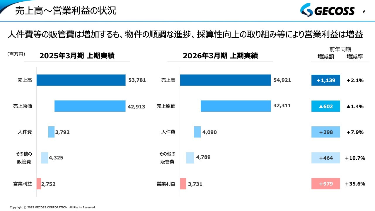 具体的な数値は記載していませんが、人件費を含む状況を見ると、売上高から売上原価を差し引いた売上総利益率が、前年同期比で約3パーセント改善していることがわかります。すなわち、約1パーセントのコスト増をしっかりと売上利益でカバーした結果、営業利益は前年同期比で約10億円、35.6パーセント増加で着地しました。
