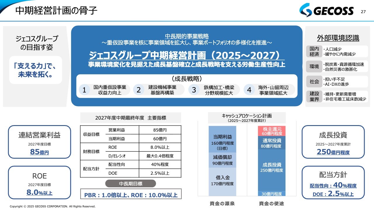 これまでにもご説明してきましたが、資本政策と中期経営計画の進捗状況についてお話しします。当社は、2026年3月期を初年度として、中期経営計画の取り組みを進めています。スライドは中期経営計画公表の際にお示しした資料のため詳細は省略しますが、2026年3月期から2028年3月期の3年間で、連結営業利益を85億円、ROEを8.0パーセント以上とすることを目標に掲げています。また、成長投資についても250億円程度を計画しています。