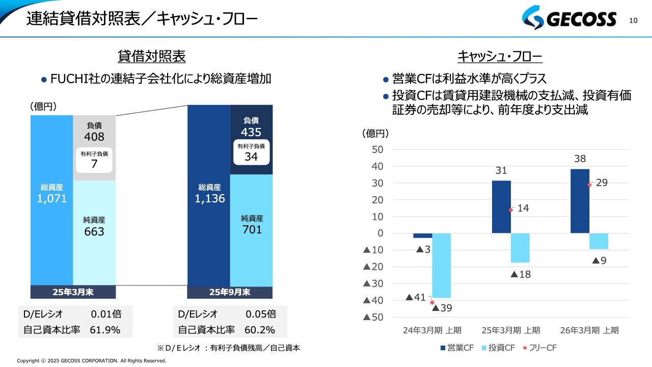 連結貸借対照表とキャッシュ・フローについてご説明します。バランスシートでは、8月にシンガポールのFUCHI社を持分法適用関連会社から連結子会社化したことにより、負債と純資産が増加し、その結果、総資産も拡大しました。この影響で、若干ではありますがD/Eレシオが上昇し、自己資本比率が低下しましたが、引き続き非常に健全な財務体質を維持しています。