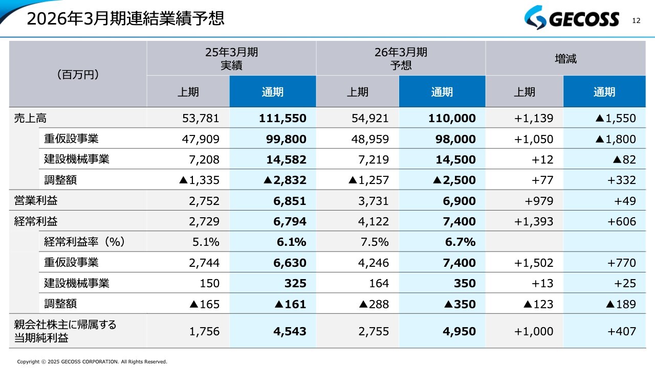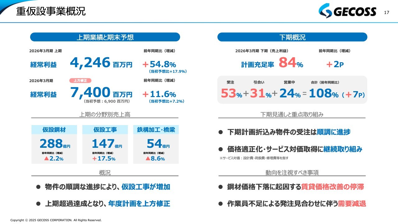 これまでのご説明と重複する部分もありますが、重仮設事業の経常利益は42億円となり、当初予想や前年同期比でも大幅に増加しています。これが上期増益の主な要因となっています。また、2026年3月期の経常利益予想については、当初予想の69億円から5億円上乗せし、74億円としています。