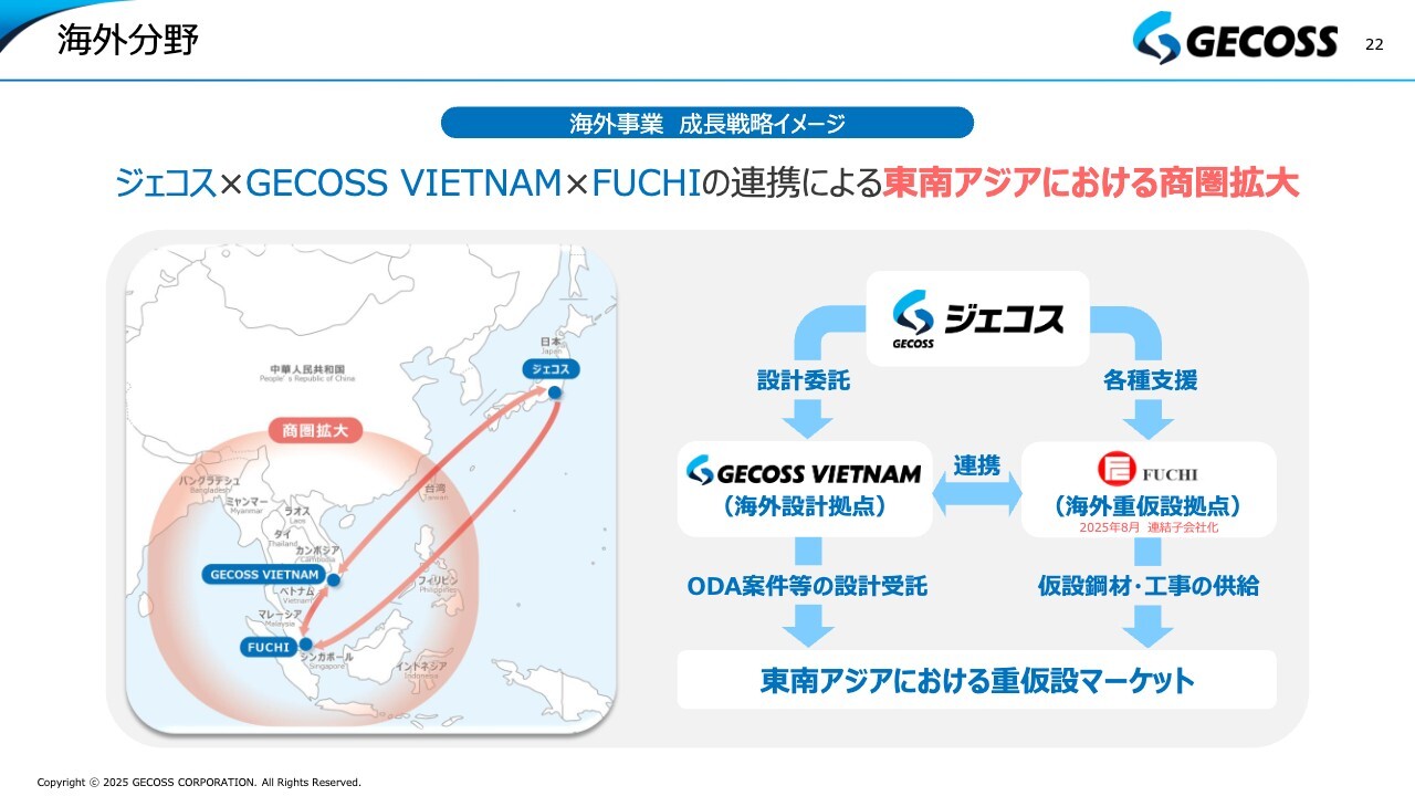 その上で、FUCHI社と、もともと所有している海外の設計拠点として重要度を増しているGECOSS VIETNAMの2社を合わせたかたちで、ASEANを中心とした展開を検討していきたいと考えています。