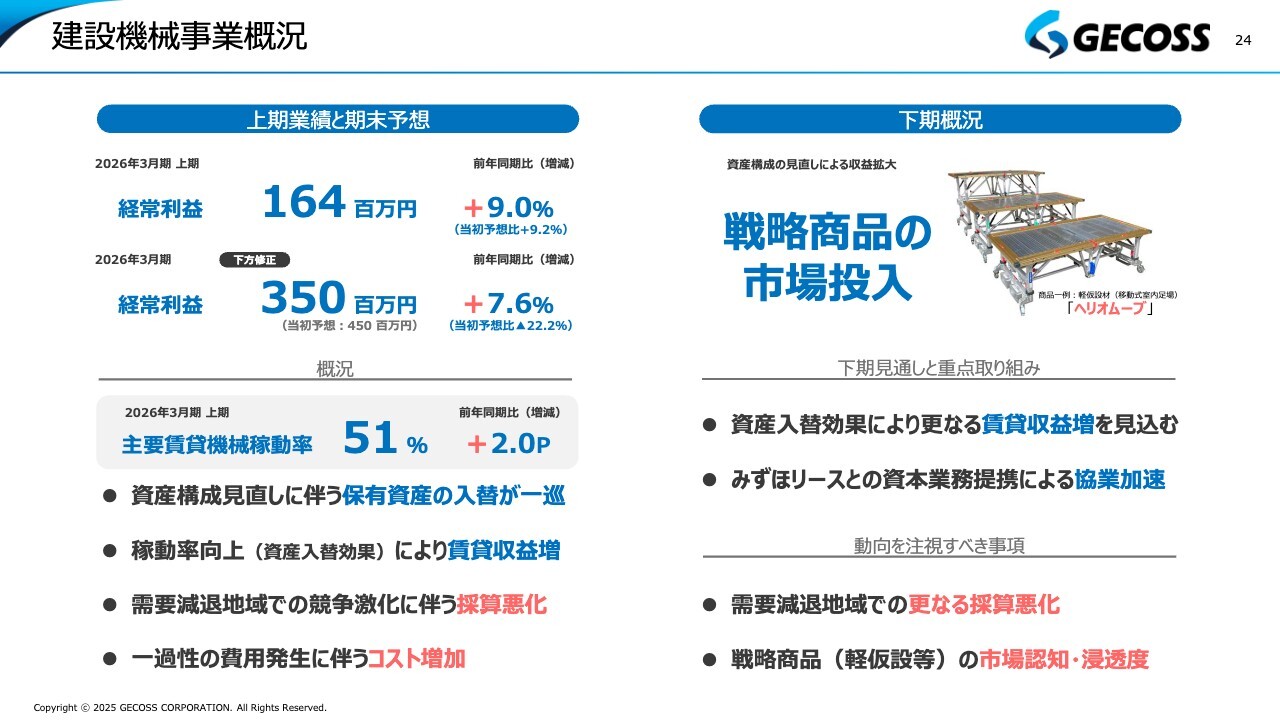 続きまして、もう1つのセグメントである建設機械事業の概況についてです。スライド左側に記載しているとおり、上期の経常利益は前年同期比で増加しました。一方、2026年3月期の経常利益予想については、下期に東北地域を中心に若干の需要減少が見られたため、当初予想の4億5,000万円から3億5,000万円に見直しました。