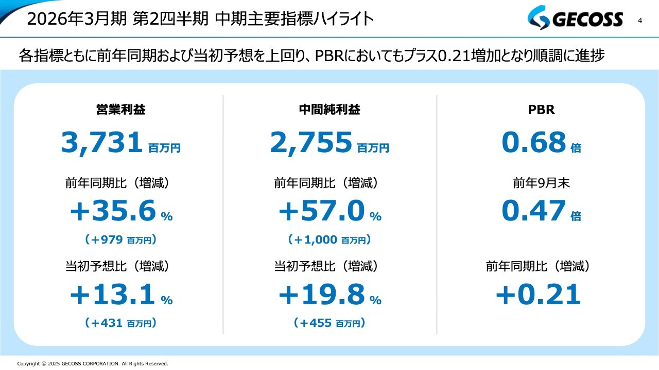 まず、2026年3月期第2四半期、すなわち上期の決算概要についてご説明します。スライドは、ハイライトとして主要な指標を記載しています。営業利益、中間純利益、PBRのいずれも、かなり良い数字で着地しました。