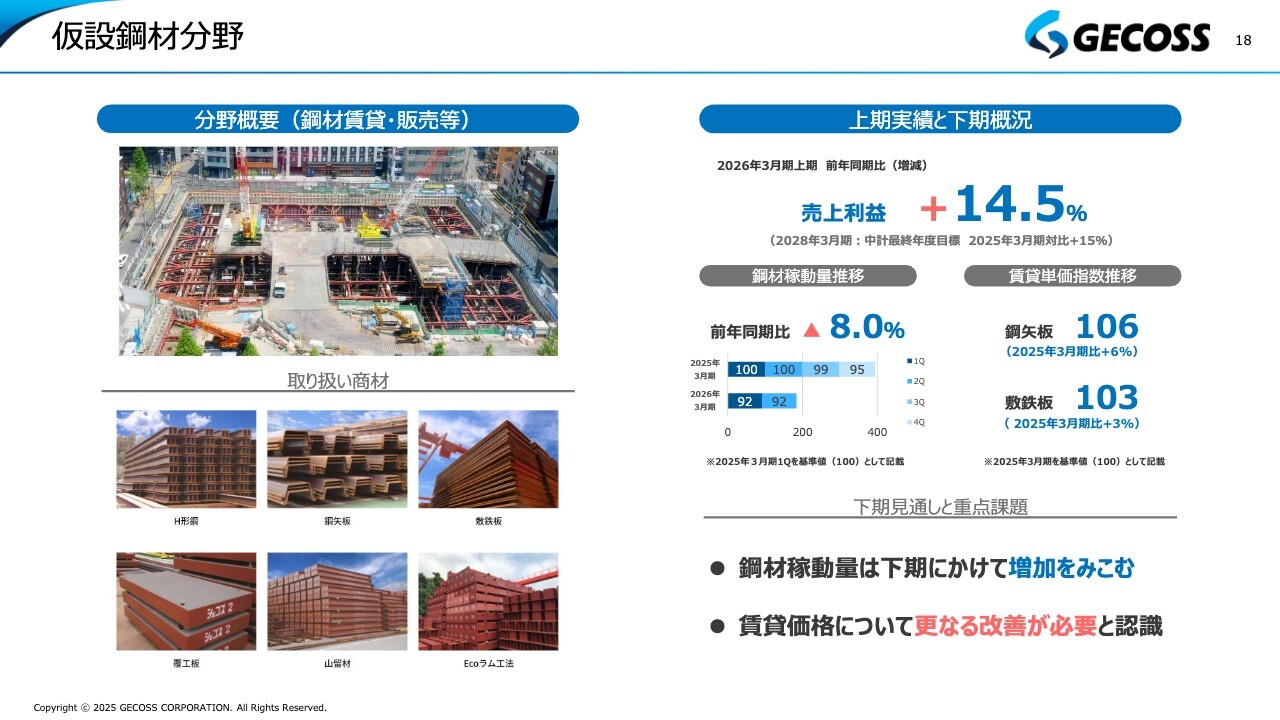 重仮設事業については、今期から仮設鋼材、仮設工事、鉄構加工・橋梁の3つに分けてご説明しています。まず、仮設鋼材分野についてです。主要な事業領域の1つとして、スライド左側のような商材を賃貸または販売しています。当分野の上期の実績は、売上高および利益が前年同期比で約15パーセント増加しています。
